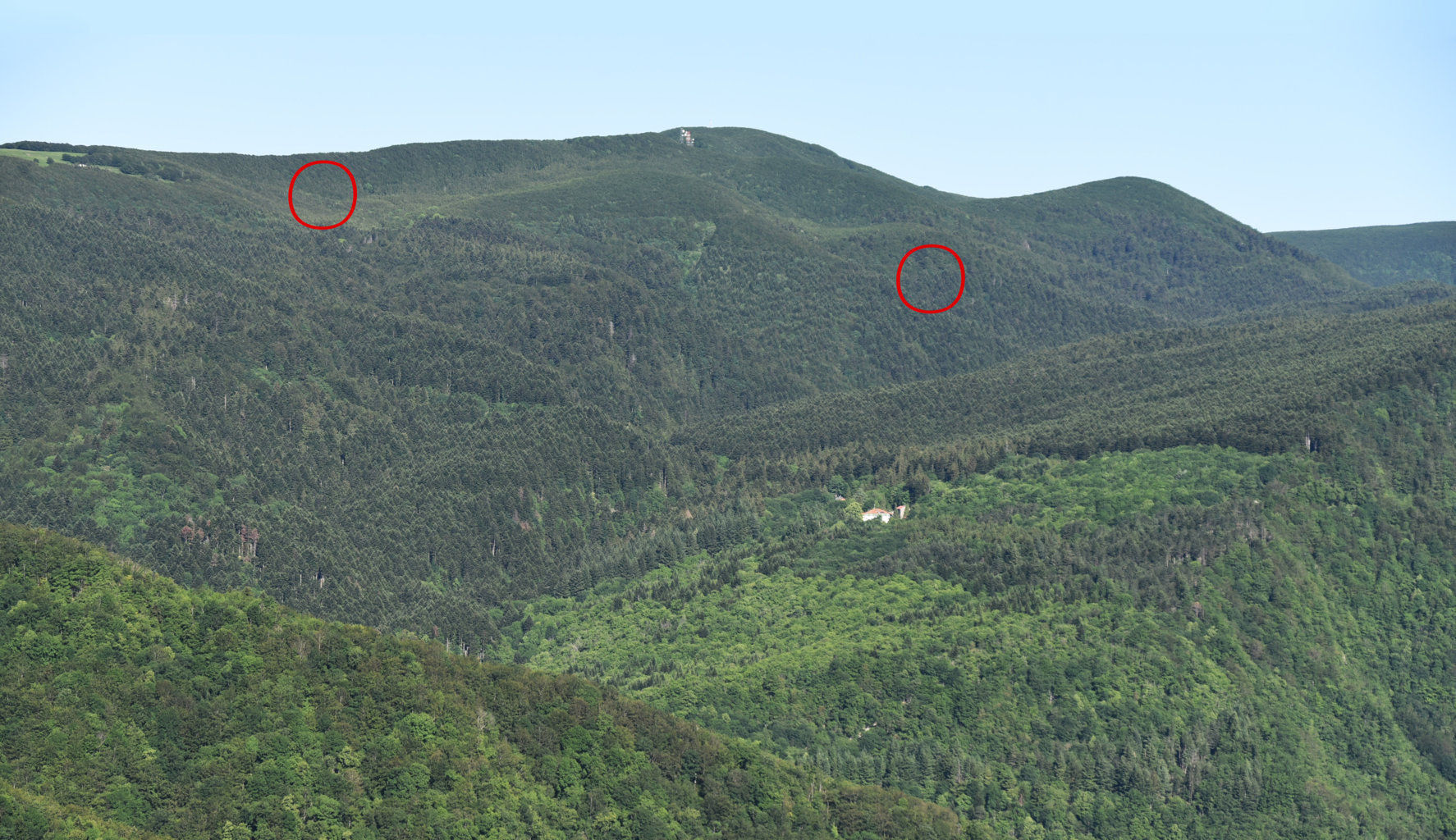 00c1 – 00c2 – Da Poggio Capannina, scorci ravvicinati sull’Abetina di Campigna con segnalazione approssimativa dei siti della Fonte al Bicchiere e della Fonte di Maldo (2/06/18).