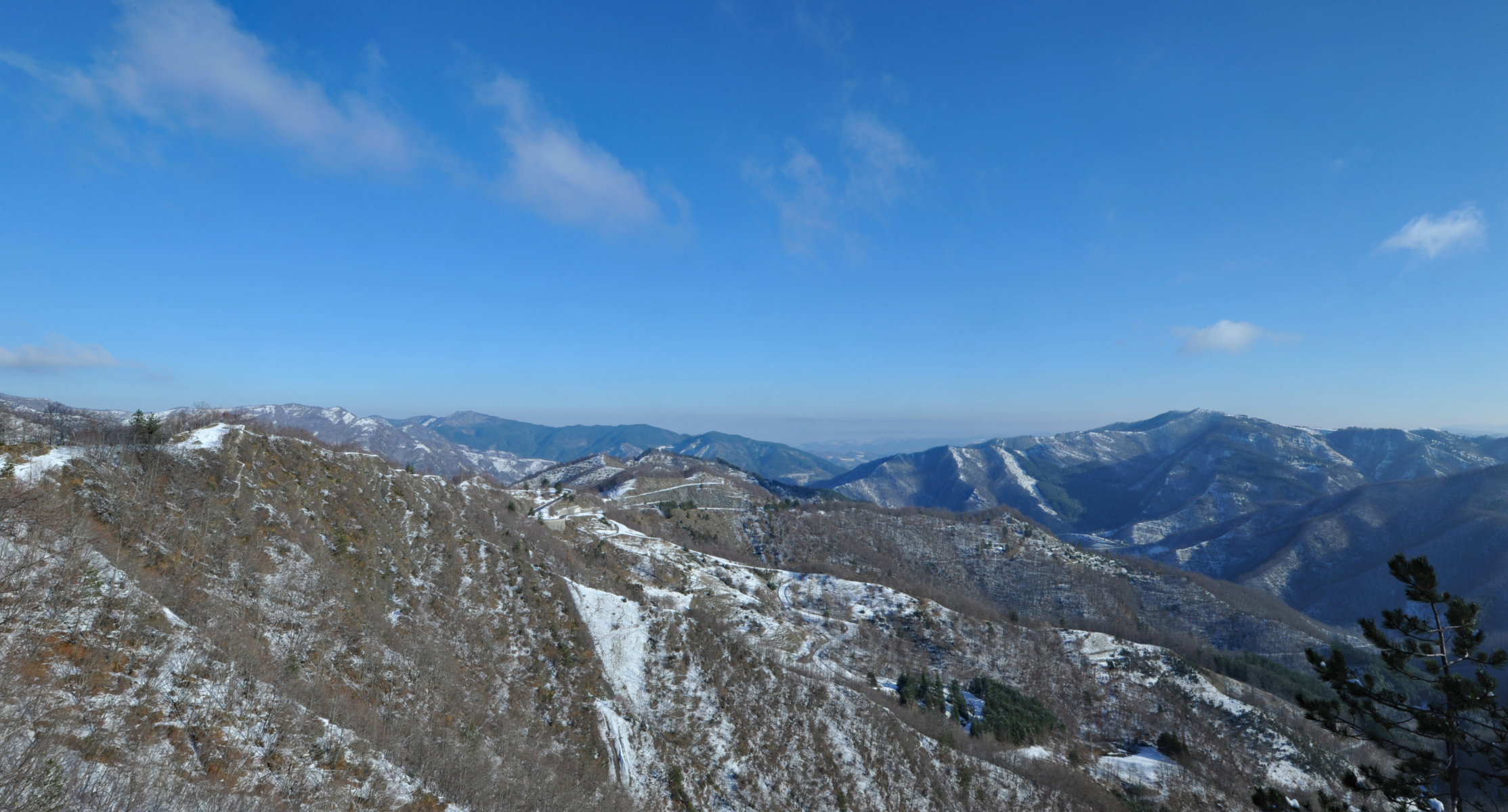 00b1 – 00b2 - 00b3 – Dal crinale tra i Poggi Squilla e Aguzzo, a monte di Ristéfani, veduta di gran parte della valle del Bidente di Campigna che permette di apprezzare i profili delle valli dei Fossi di Montaccesi, di Castagnoli, della Fonte e del Forcone e indice fotografico (25/04/18).