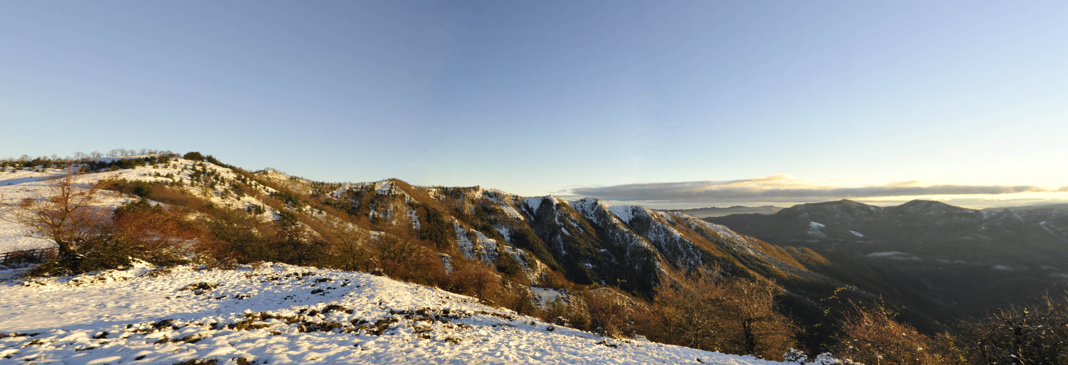 001a – 001b – Dal Monte Penna, veduta panoramica sulla Valle di Ridràcoli, delimitata dal contrafforte da cui si staccano le dorsali che delimitano il sistema vallivo afferente all’invaso. È evidenziata la Valle del Rio Bacine (7/02/11).