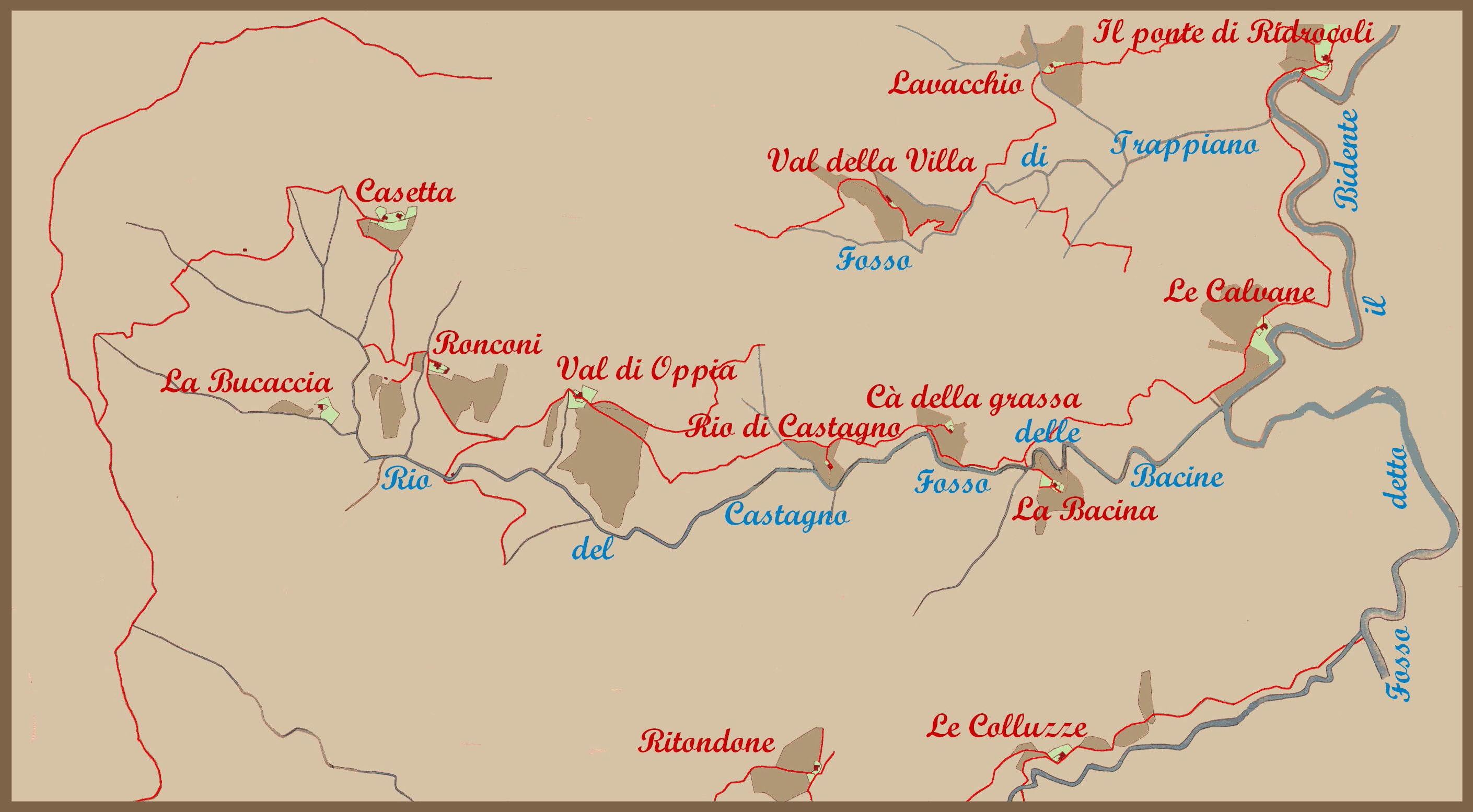 - Rio di Castagno nel Catasto toscano, o anonimo nella Carta d’Italia I.G.M. (1894-1937), o assente in quella moderna, nel N.C.T. e nella C.T.R.;