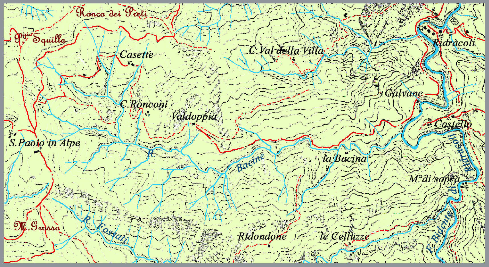La Valle del Rio Bacine, abitata fin dal XVI secolo pur possedendo modeste caratteristiche colturali, era attraversata dalla mulattiera che collegava Ridràcoli con S. Paolo in Alpe staccandosi dal Ponte di Ridracoli e percorreva la sx idrografia transitando dalle Galvane prima di penetrare al suo interno. Nel fondovalle sorgevano Rio di Castagno, Cà della Grassa già Cà della grassa e La Bacina o Le Bacine o (alla romagnola) Le Basine (presso il Monte della Basina) o Bacie. Più alti vi sorgevano i fabbricati di Casette o Le Casette già Casetta, La Bucaccia, Ronconi, Valdoppia già Valdelopia o Val di loppia o Val di Oppia e St.le Valdoppio e Sermolino. Presso Ronconi sorge (restaurata) già dal 1784 la Maestà Maria Mater Gratiae o Maestà Ronconi.