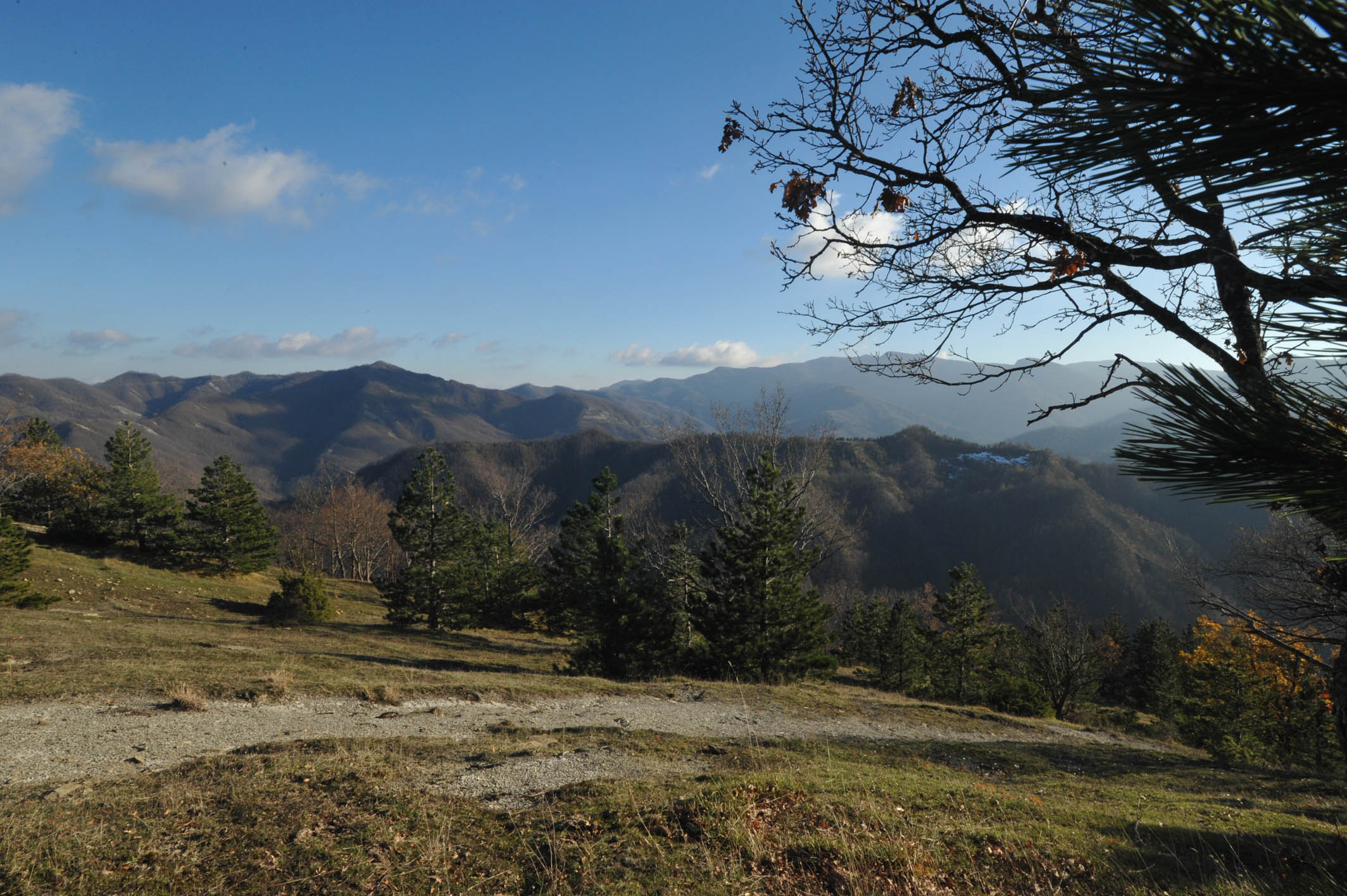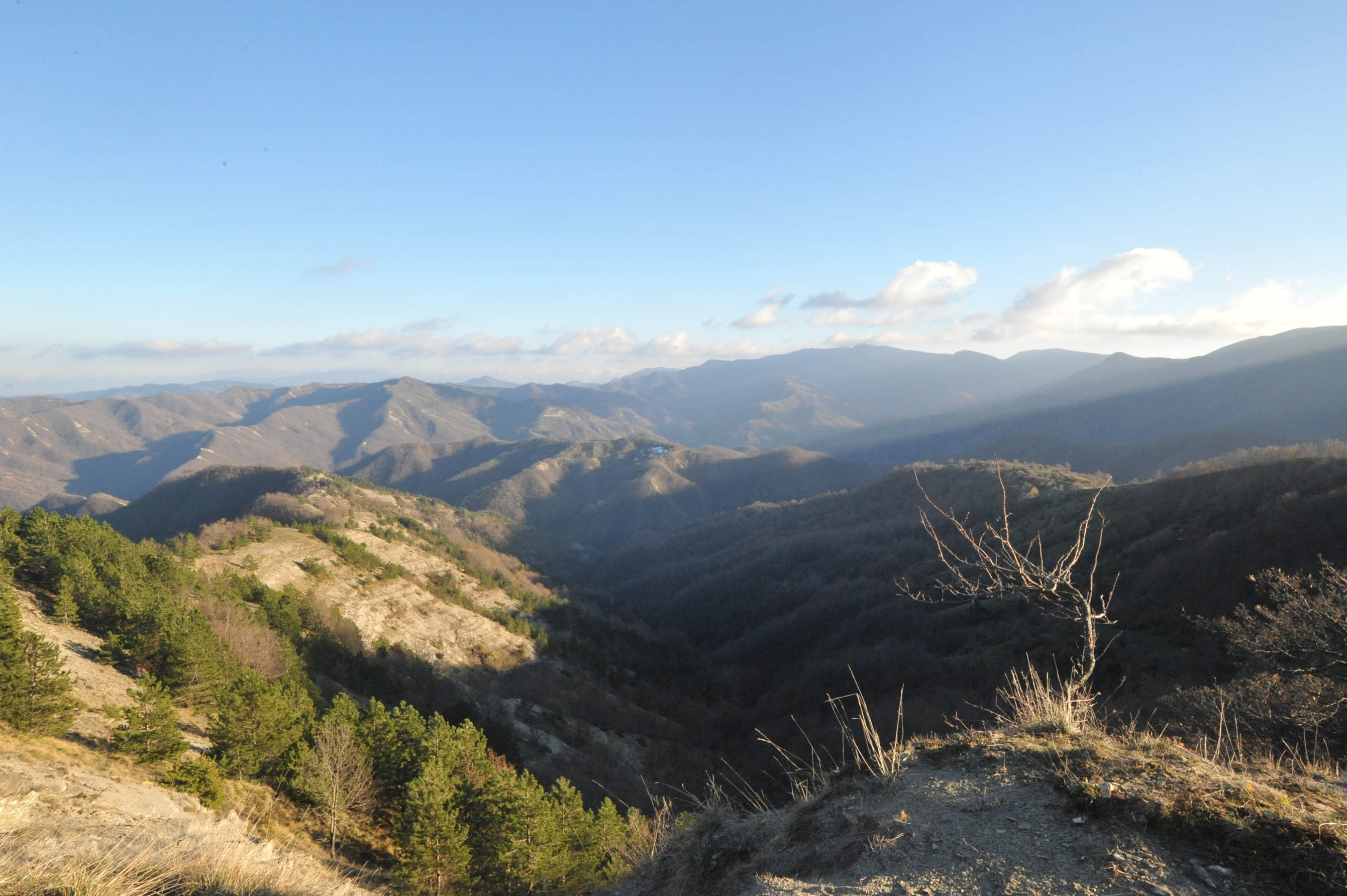 001a – 001b – Dal Monte Penna, veduta panoramica sulla Valle di Ridràcoli, delimitata dal contrafforte da cui si staccano le dorsali che delimitano il sistema vallivo afferente all’invaso. È evidenziata la Valle del Rio Fossati (7/02/11).