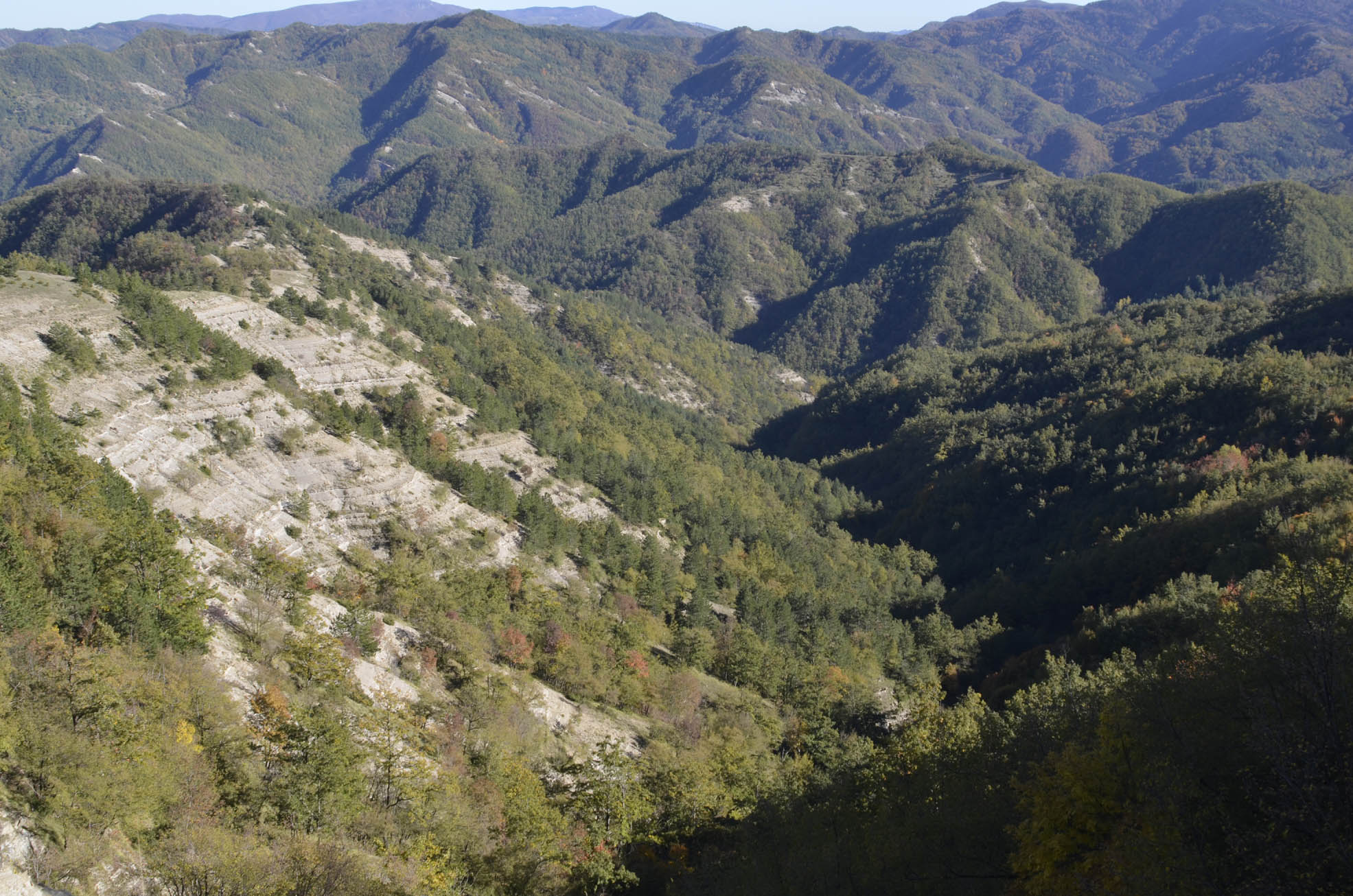 002a/002q - Dalla Valle del Ciriegiolone, attraversata da una strada poderale che si diparte dalla S.F. S. Paolo in Alpe-La Lama presso il M. Grosso, vedute della valle, proiettato verso il lago di Ridràcoli, e delle le stratificazioni esposte del suo versante meridionale culminante nel Crinale della Vacca (27/04/12 – 21/11/18).