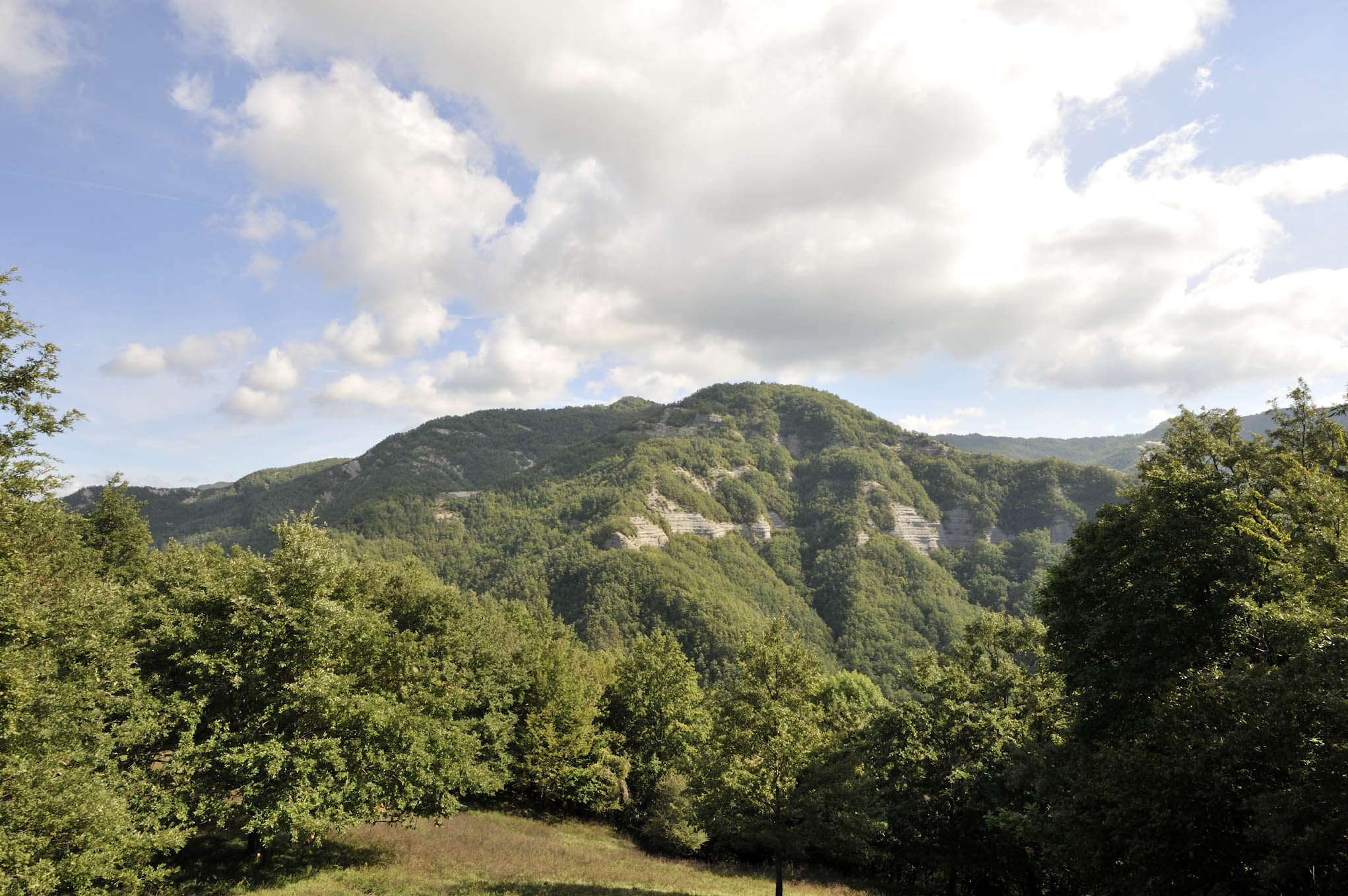 005a – 005b – Veduta frontale del crinale della Seghettina, che consentiva l’attraversamento del Bidente tramite il Ponte alla Forca, in asse con la Costa Poggio Piano dove si sviluppava l’antica strada fino al Passo La Scossa (8/09/11).
