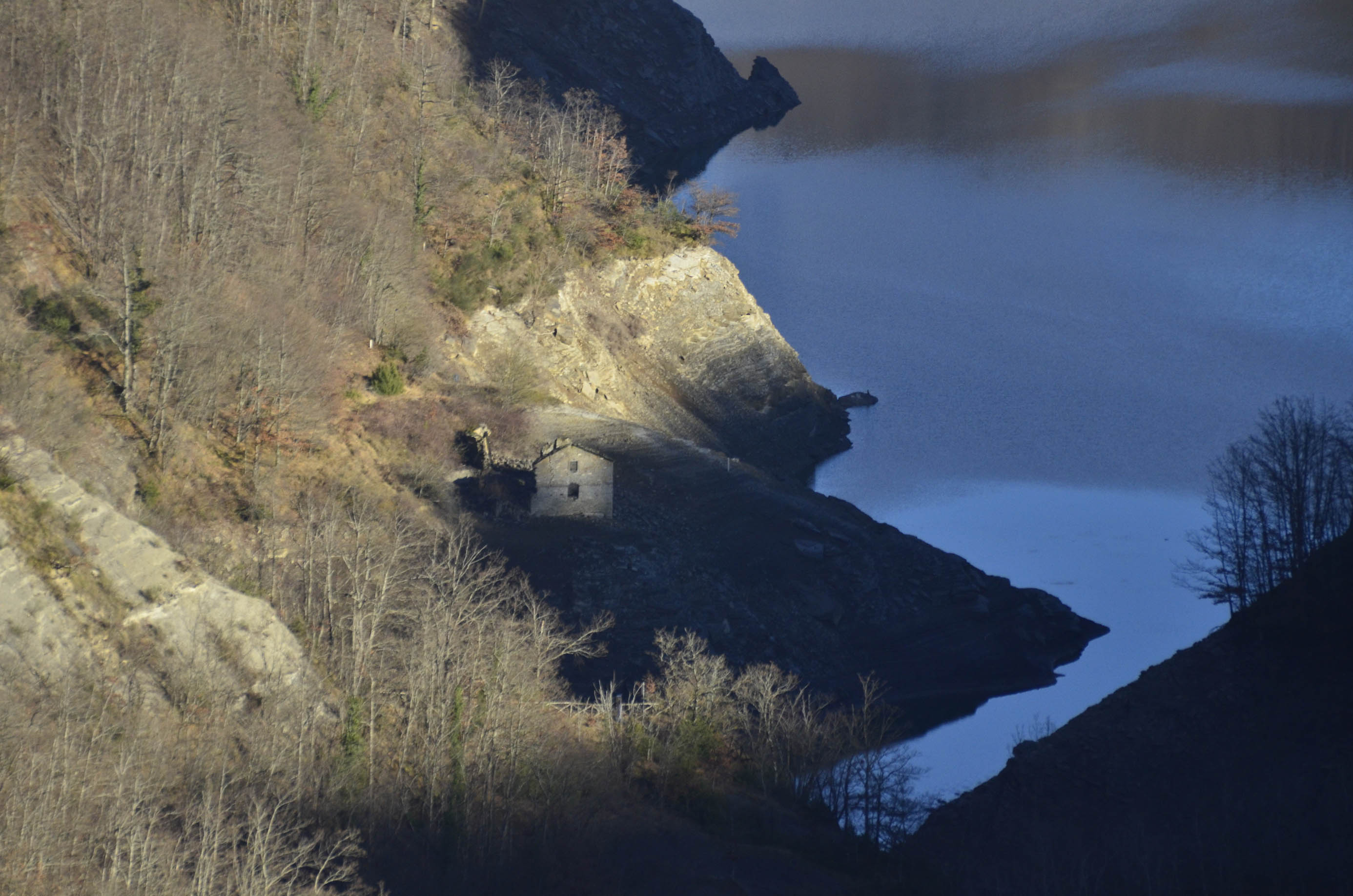 002p/002z – Dal Crinale della Vacca e nel discendere verso Ridondone, vedute del braccio lacustre del Molinuzzo; sul bordo delle acque emerge Celluzze. Alzando lo sguardo si nota il versante del Monte Cerviaia inciso dal Fosso del Fontanone con il podere della fatiscente Casetta in fase di ricolonizzazione arbustiva (10/12/15 – 22/12/16).