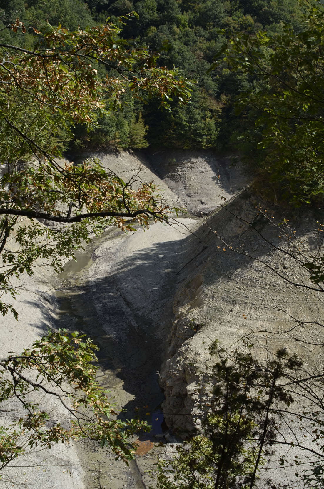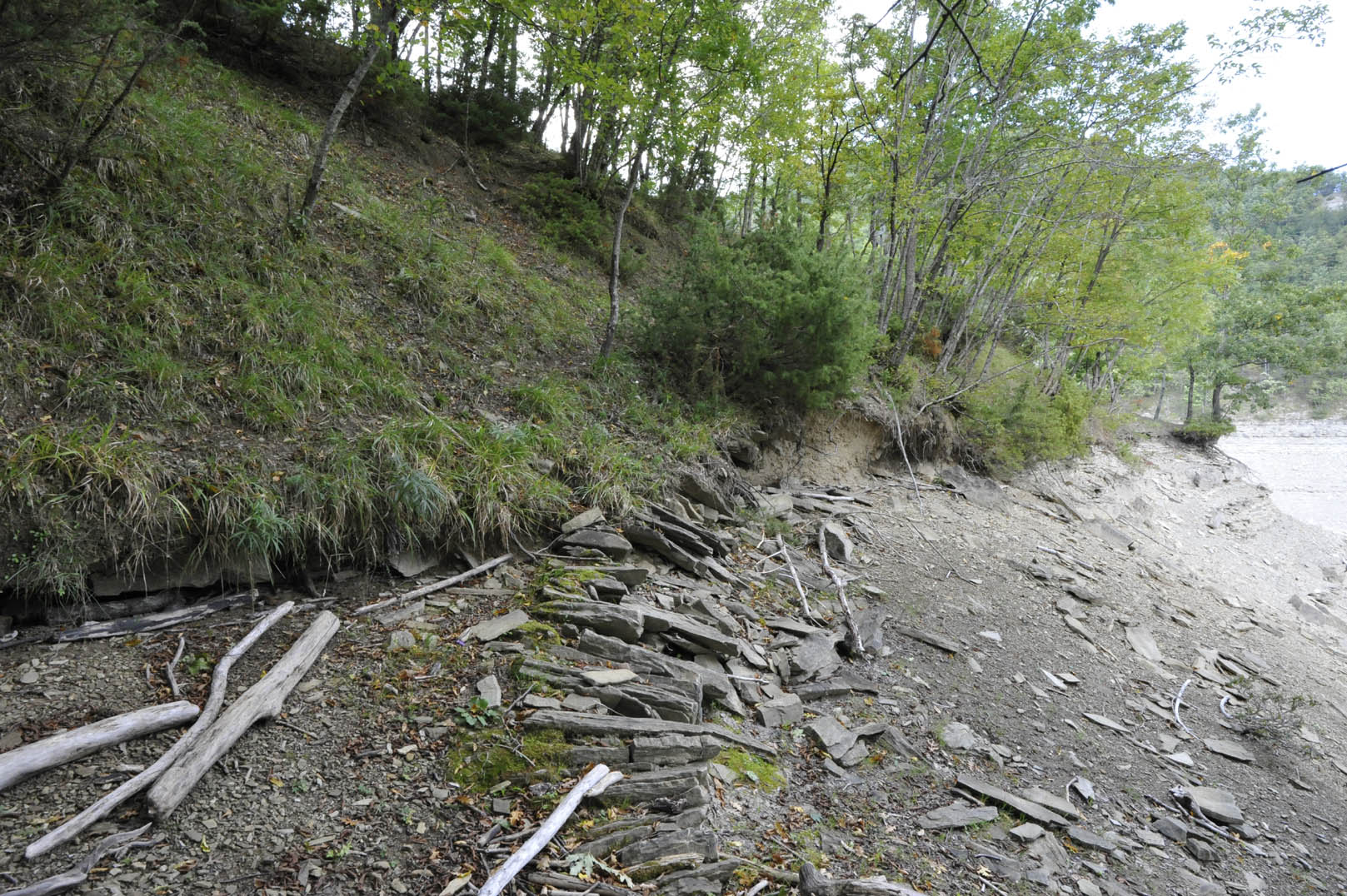 004c/004f – Il braccio lacustre del Molino a monte del braccio della Lama; è evidente la deformazione tettonica degli strati delle basse pendici del M. Palestrina in conseguenza delle forti spinte cui sono state sottoposte le rocce (24/09/19).