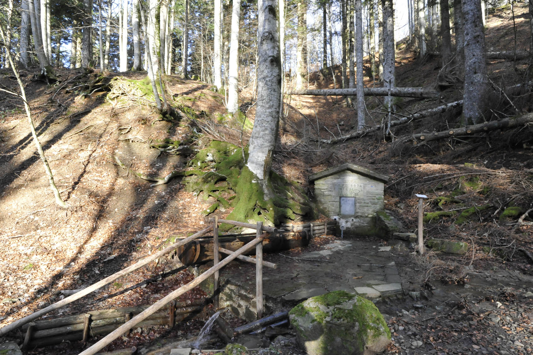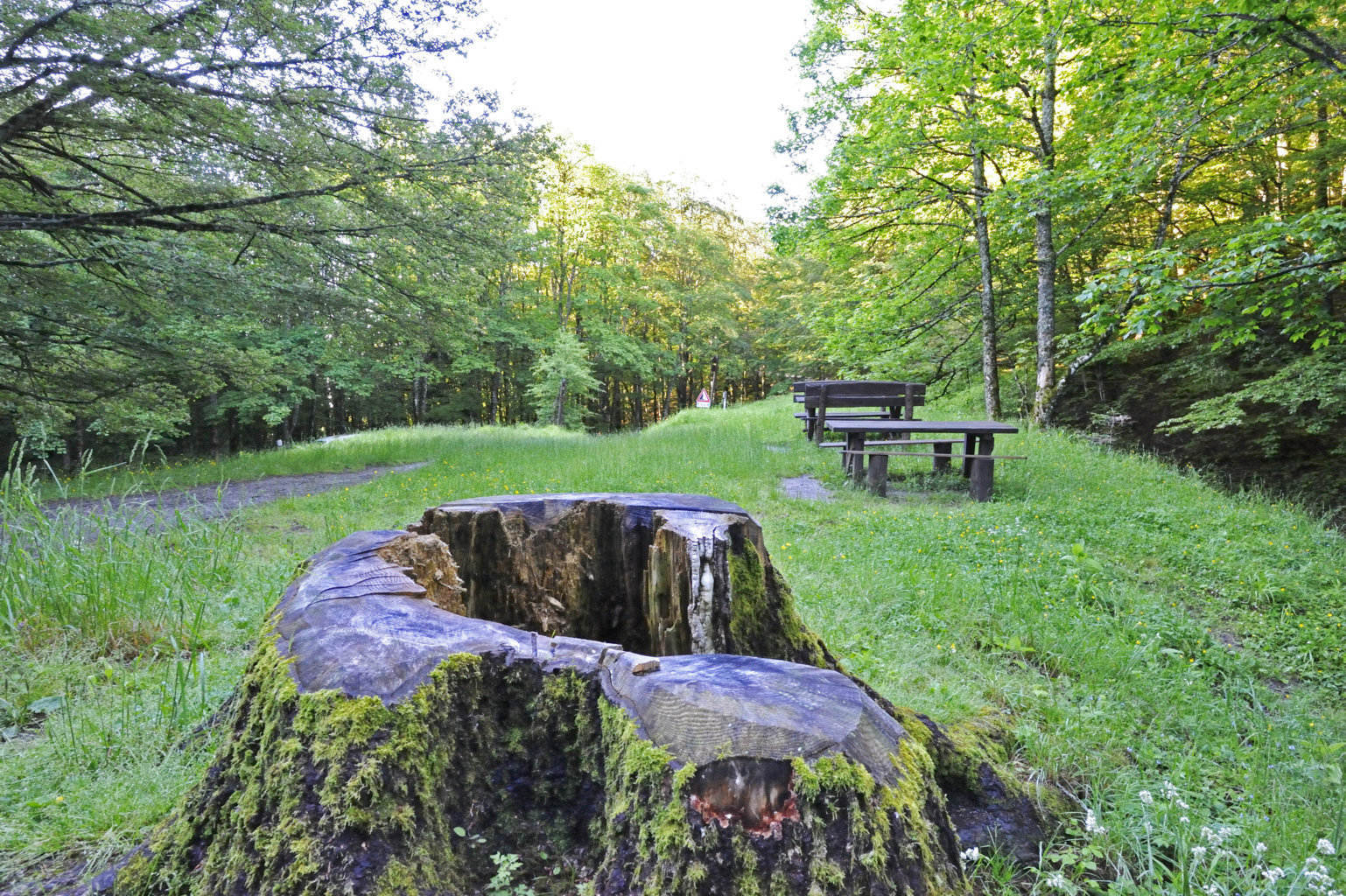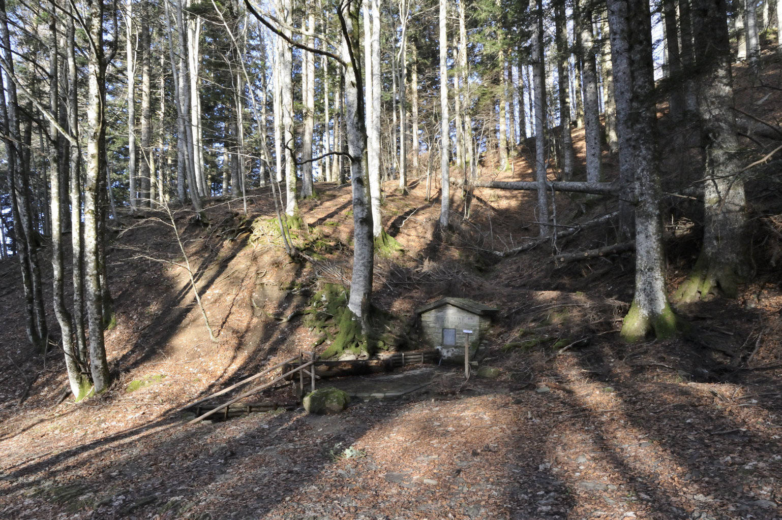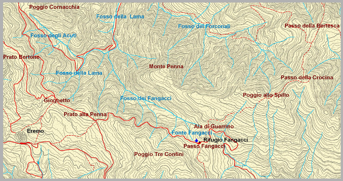 Fino al Sei-Settecento per l’area della sella erano noti i toponimi Beventi e Fonte dei Beventi, evidentemente guadagnati per la ventosità che vi si incalanava. Nel 1605 Beventi era un “luogo da aggirare e seminare abeti”; nel 1652 un funzionario dell’Opera relaziona di “una spiaggia che si dice i Beventi luoghi tutti coperti per lo più di faggi non d’abeti” posta sopra La Lama verso i crinale; nella citazione soprariportata relativa al contratto del 1818 tra l’Opera e i camaldolesi si accenna al “crine dei Beventi” e alla “Fonte dei Beventi o del Gioghetto”, ma solo nel 1824, nella specifica mappa del Catasto toscano (Sezione A, Foglio 2o) oltre alla Fonte del Gioghetto compare il toponimo Fangacci ed occorre attendere la fine del secolo e la pubblicazione del Foglio 107 II della Carta d’Italia I.G.M., rilevato nel 1893, per trovare trascritto il toponimo P.so dei Fangacci, quando la nuova Strada ordinaria a fondo artificiale (futura S.P. n.69 dell’Eremo) ancora non lo raggiungeva, fermandosi all’Eremo. Nel catasto antico la strada che dall’Eremo giungeva al passo è detta Via della bertesca e quella che proseguiva fino al Passo della Crocina (detto Sodo di Rombicetino) è la Via dall’Eremo in Romagna, ma era detta anche strada dei Fangacci e della Bertesca che nelle Bozze di mappe catastali diviene Strada di legni che va alla Bertesca, a segnalarne l’utilizzo promiscuo. In base alle mappe antiche il percorso tendeva ad avvicinarsi al crinale tra Poggio allo Spillo e La Crocina, probabilmente coincidendo con le tracce di cui si nota la presenza. Inoltre, nella Pianta dimostrativa di una porzione della tenuta della Badia a Prataglia di proprietà del Sig. Filippo Biondi di Bibbiena, risalente al 1846 (cfr.: M. Ducci, G. Maggi, B. Roba, 2024, p. 173, cit. e https://www502.regione.toscana.it/searcherlite/cartografia_storica_regionale_start.jsp), anche il tratto che attraversa il Passo dei Fangacci era detto Strada dei Legni forse ricomprendendo la via che ancora vi giunge da Badia Prataglia tramite Vetriceta. In alto si affiancava una Via delle terre rosse diretta verso l’Aia di Guerrino, presso la quale una breve e moderna pista forestale in dx idrografica del fosso consente di raggiungere la Fonte di Guido. Il toponimo Aia di Guerrino compare per la prima volta nella Carta d’Italia di rilevata nel 1937 ed oggi il luogo è noto come Area di sosta. Nell’ambito del Programma LIFE e del progetto WetFlyAmphibia (conservazione di anfibi e farfalle di aree umide e loro habitat nel Parco delle Foreste Casentinesi), presso la Fonte di Guido è stata realizzata una vasca abbeveratoio per anfibi ed ungulati. Le specie interessate dal progetto sono l’Ululone dal ventre giallo (Bombina variegata), la Salamandrina dagli occhiali (Salamandrina tergiditata) e il Tritone crestato (Triturus carnifex). In tale occasione è stata anche risistemata l’area e la fonte stessa è stata nuovamente restaurata. Al passo giungeva inoltre da Mezzogiorno, versante di Serravalle, la Via dei nespoli (oggi 66 CAI) mentre una via segnata nelle mappe di metà e fine ‘800 in sx del Fosso dei Fangacci consentiva di raggiungere La Lama da Badia Prataglia: un primo tratto dal rifugio fin quasi all’attraversamento del fosso è poi divenuto parte del noto Sentiero degli Scalandrini (227 CAI), con la celebre cascata, mentre rimangono consistenti tracce del restante percorso abbandonato che va ad immettersi nella Strada degli Acuti mantenendosi in sx idrografica.