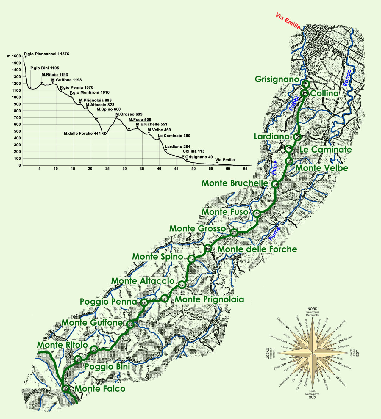 Schematizzando, la linea del crinale appenninico ai due estremi del tratto tosco-romagnolo, in coincidenza del Passo della Futa e del Passo di Viamaggio, presenta due nette inflessioni dove si modifica la direzione di sviluppo dello Spartiacque rispetto ai tratti precedente e successivo. Anche i contrafforti che da esso si distaccano proiettandosi verso l’area padana presentano un diverso orientamento a seconda del rispettivo tratto di origine: «[…] il crinale appenninico della nostra Provincia (e della Romagna) ha la direzione pressoché esatta da NO a SE […] hanno […] orientamento, quasi esatto, N 45° E, i contrafforti (e quindi le valli interposte) del territorio della Provincia di Forlì e del resto della Romagna. […] tale direzione non continua uniforme fino a raggiungere le ultime propaggini dei contrafforti stessi verso la pianura, e cambia invece alla distanza di 25-35 chilometri dalla dorsale, per piegare verso la direzione N 25° E […] passando progressivamente a N […]» (P. Zangheri, 1961, rist.anast. 1989, pp. 9, 59 cit.). Queste serie di rupi dai profili spesso frastagliati per la velocità del disfacimento roccioso che si snodano come un bastione naturale tra le valli denominate contrafforti terminano nella parte più bassa con uno o più sproni mentre le loro zone apicali fungenti da spartiacque sono dette crinali, termine che comunemente viene esteso allo stesso rilievo cui appartengono. Nei documenti storici per indicare i crinali, specie se costituenti elementi morfologici evidenti del territorio era spesso utilizzato il termine radium, raggio, forse in quanto netti e lineari (come quelli solari), allorquando erano parte di un itinerario (che consentiva collegamenti più diretti e rapidi tra luoghi altrimenti raggiungibili tramite lunghi tragitti) e/o costituenti confine di un’area. Per rilevanza o consuetudine a volte il termine diviene esso stesso toponimo o ne fa parte (Il Raggio, Raggio del Finocchio, Maestà del Raggio, Raggio alle Secche, Raggio dei Picchi, Raggio Grosso, Raggio Lungo, Raggio Mozzo, Fosso del Raggio, Raggio di Sopra, etc.).