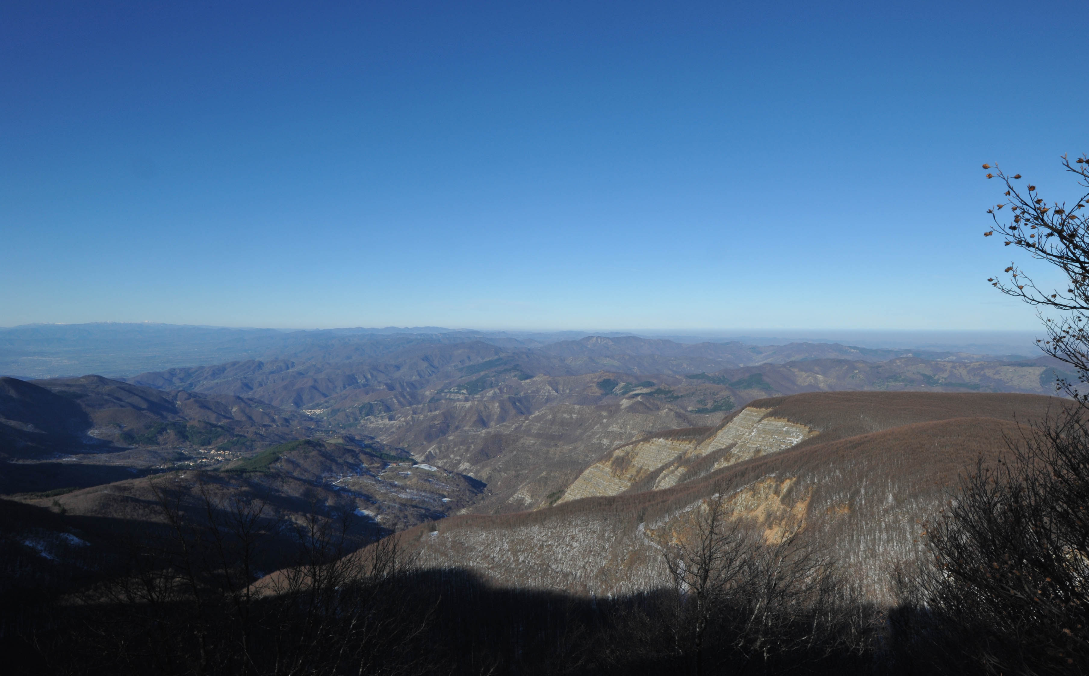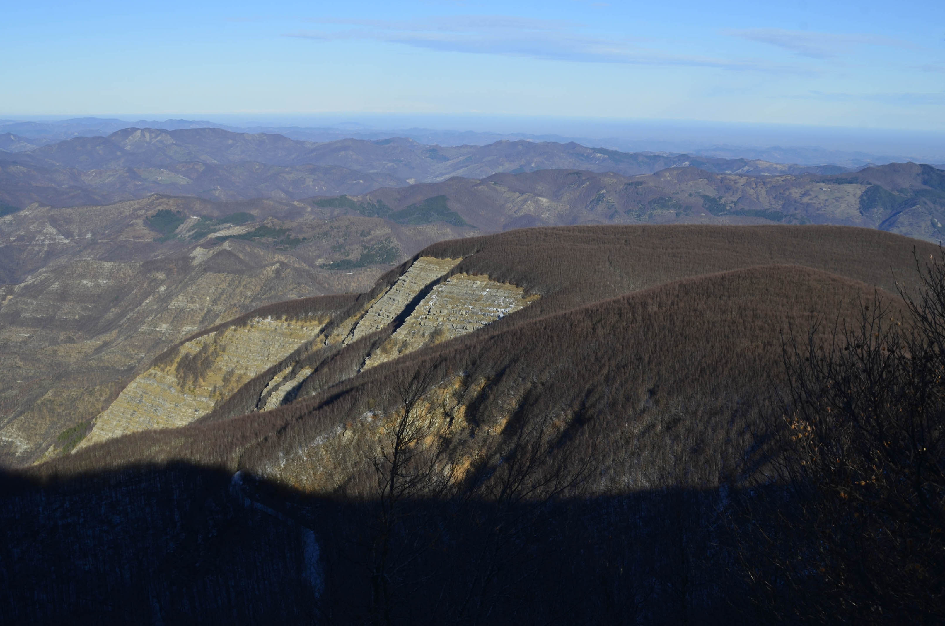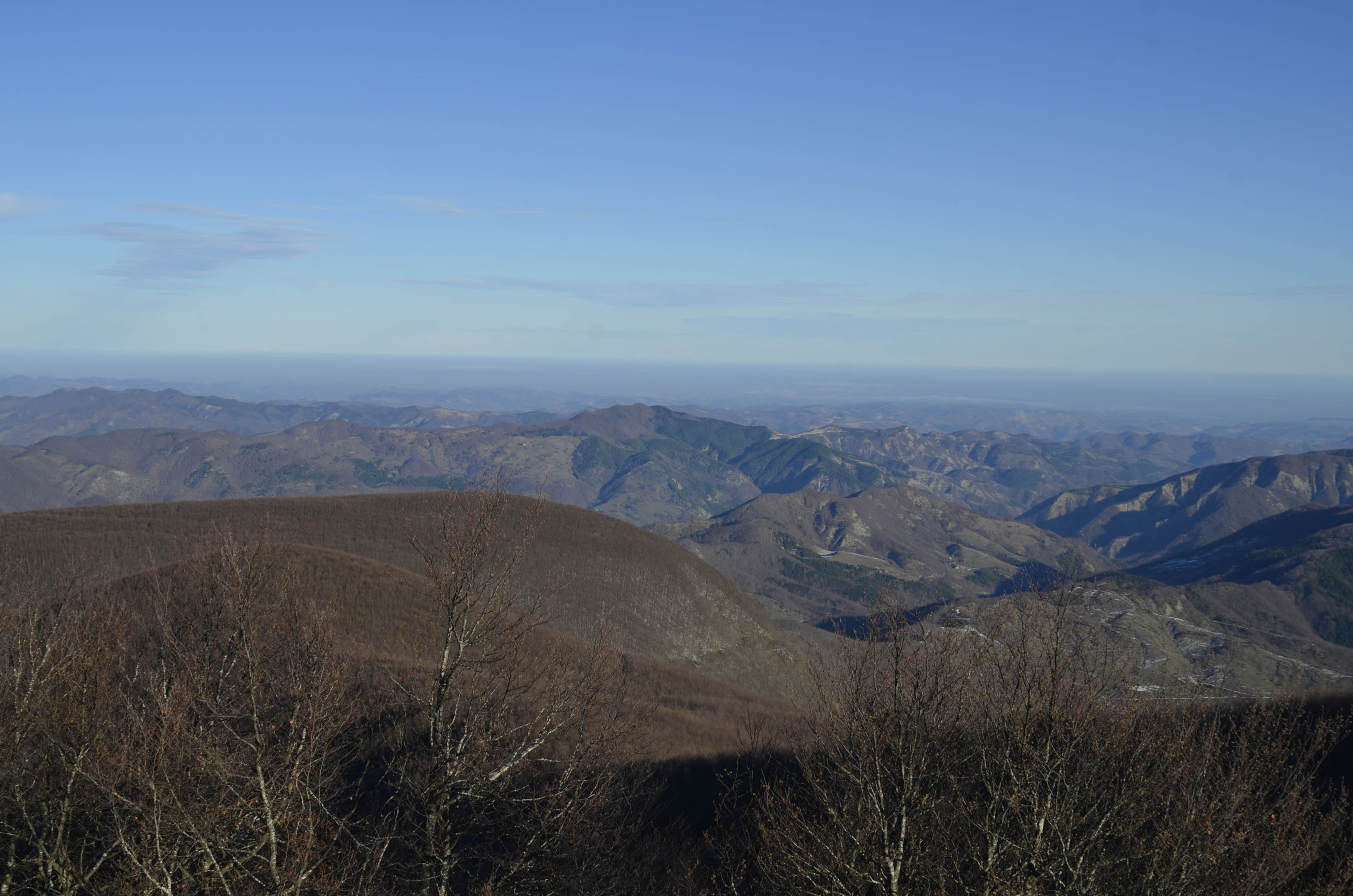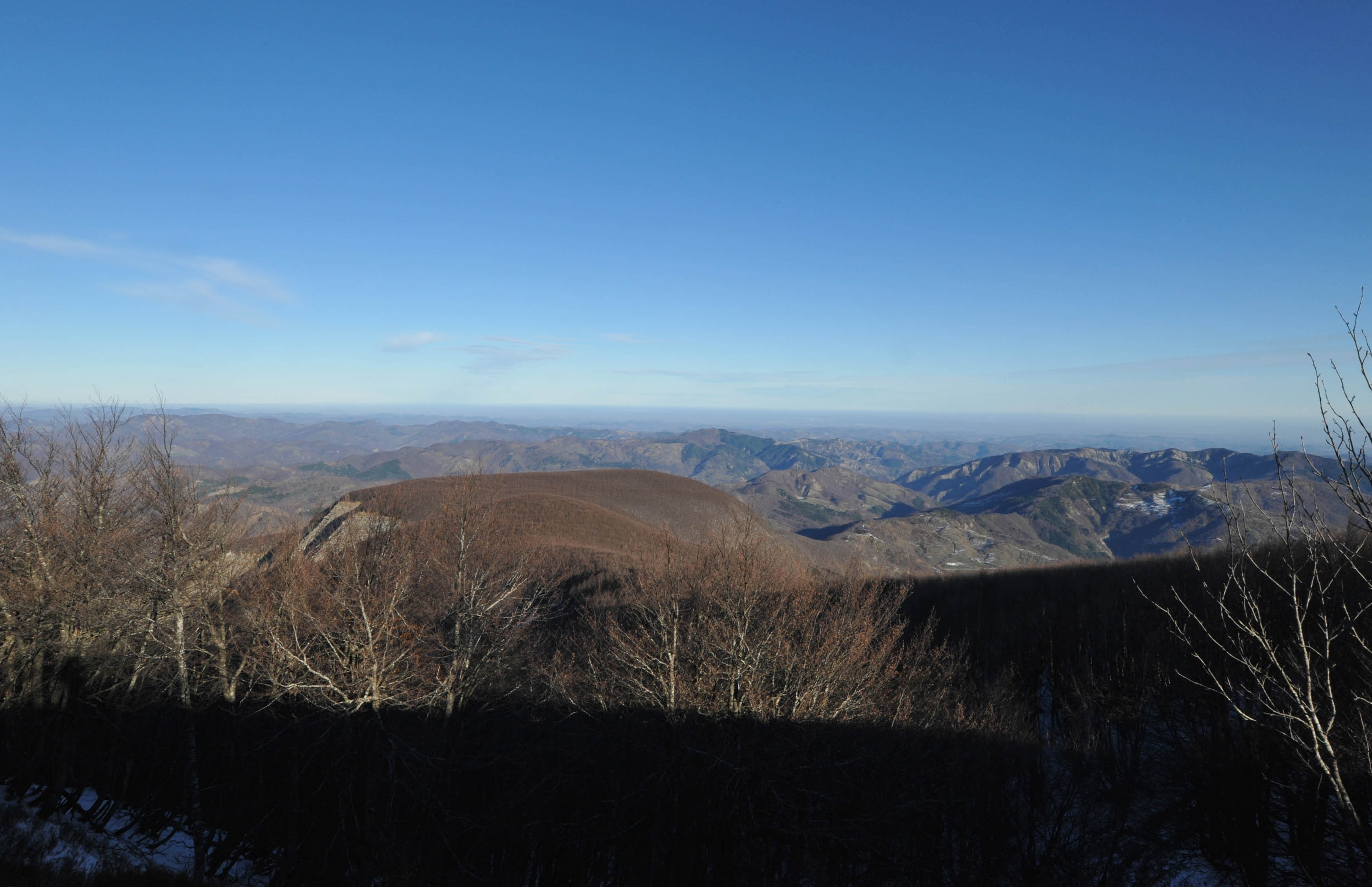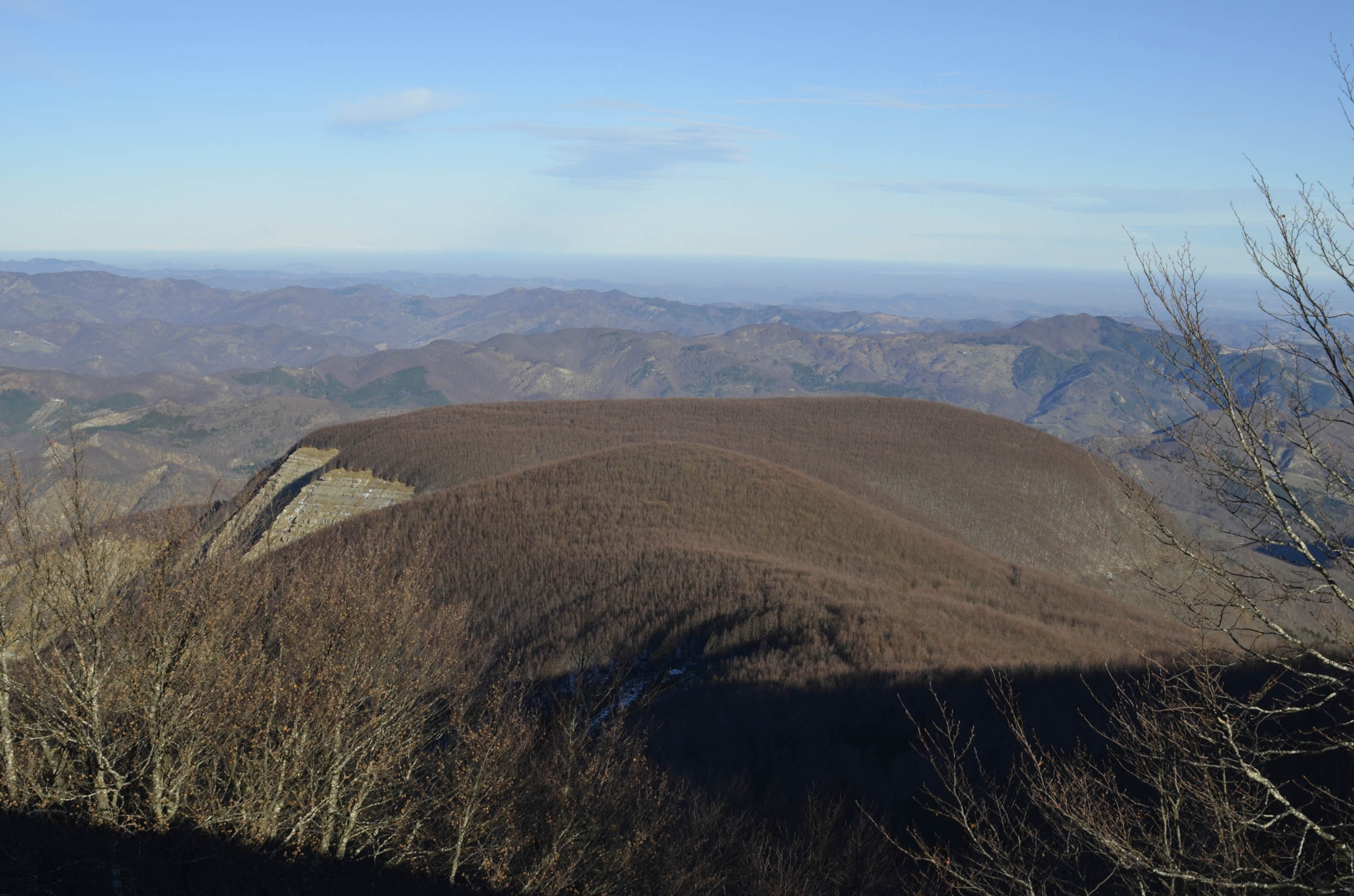 001n/001q - Dal Crinale del Corniolino, pressi Tre Faggi, oltre la dorsale di Partinico compare parte dello spartiacque appenninico e il tratto iniziale del contrafforte principale che si stacca dal complesso del Falterona. Con l’ausilio dell’indice fotografico è possibile identificare i principali rilievi (30/11/16).