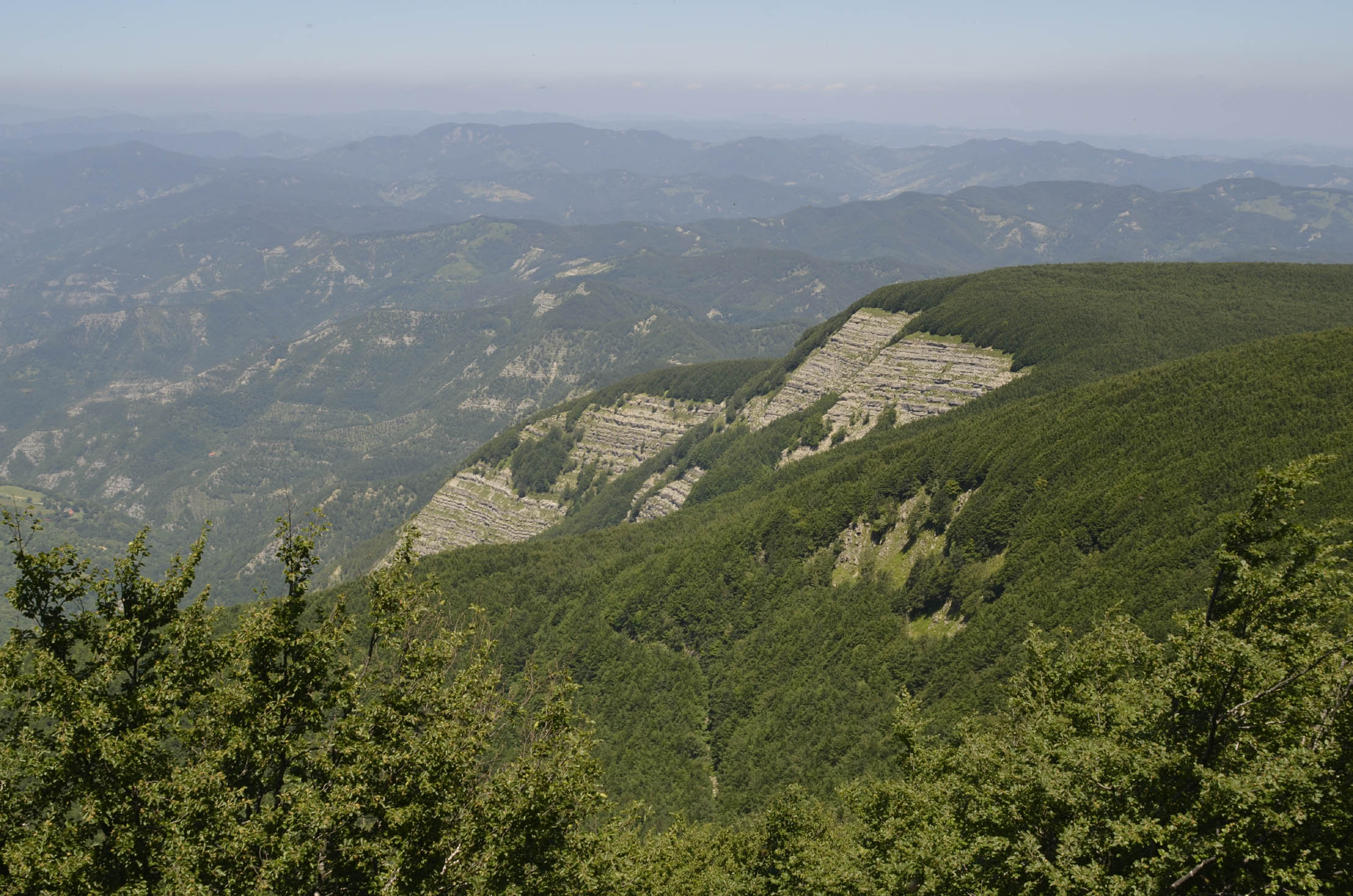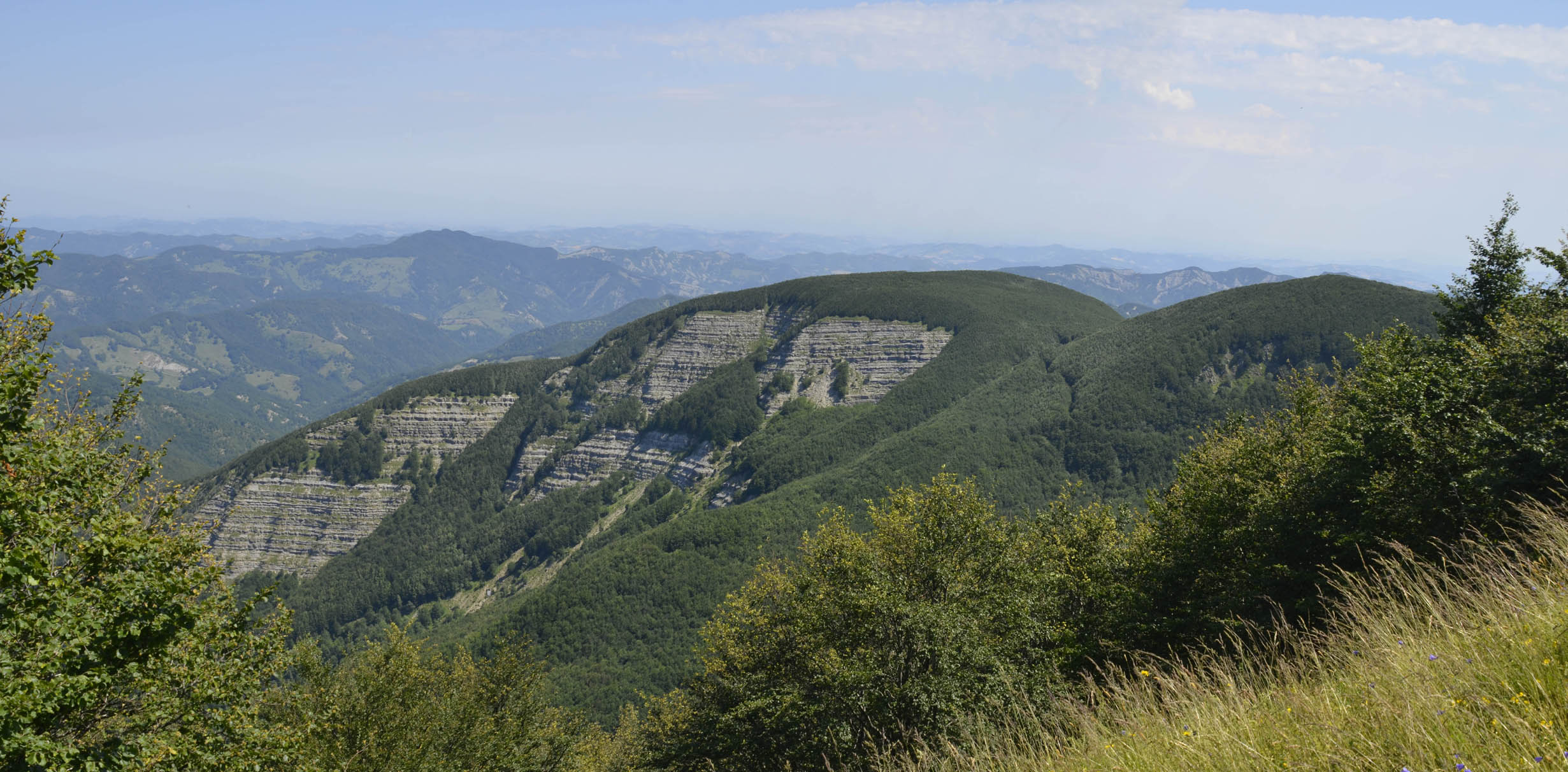 Il tratto di Spartiacque pertinente all’ambito descritto corre su altitudini tra le più elevate dell’Appennino forlivese, minime poco inferiori ai m. 1300 e massime fino ai m. 1500-1650, con abbassamenti in corrispondenza dei valichi e rialzamenti in coincidenza con i nodi montani da cui si distaccano le diramazioni montuose. L’inclinazione degli strati, immersi a SO, spiega la ripidità dei versanti esposti a settentrione della Bastionata di Campigna-Mandrioli, dove le pendenze, mediamente pari al 35%, raggiungono acclività del 70-100%, dando alla montagna il noto aspetto di imponenza e invalicabilità, con pareti evidenzianti la stratigrafia “a reggipoggio” modellata dall’erosione e la formazione di canaloni fortemente accidentati, con distacco detritico e lacerazioni della copertura forestale. A tale asprezza morfologica si contrappone la generale morbidità del crinale dovuta alla lentezza dell’alterazione delle bancate arenacee, la cui superficie coincide, appunto, con quella della stratificazione.
