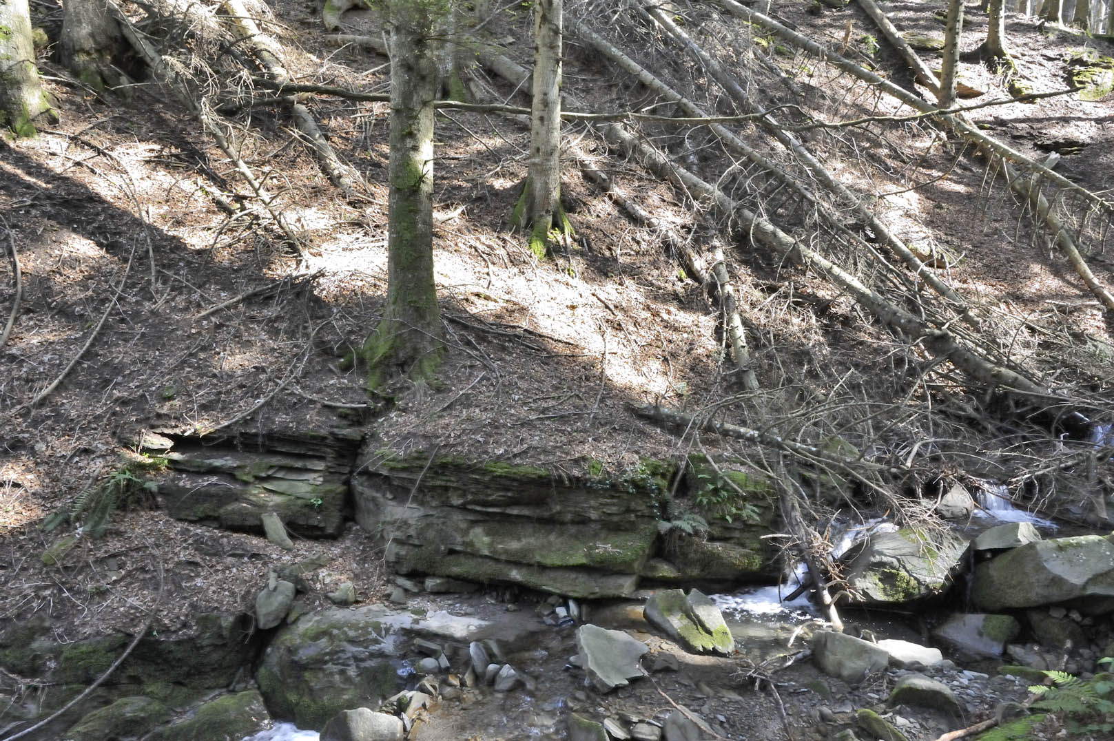 00n1/00n6 – La possente bancata arenacea della Cascata degli Scalandrini, per limitata portataidrica, mostra la nettezza della sua costituzione rocciosa per la scarsità della porzione marnosa (18/05/11).