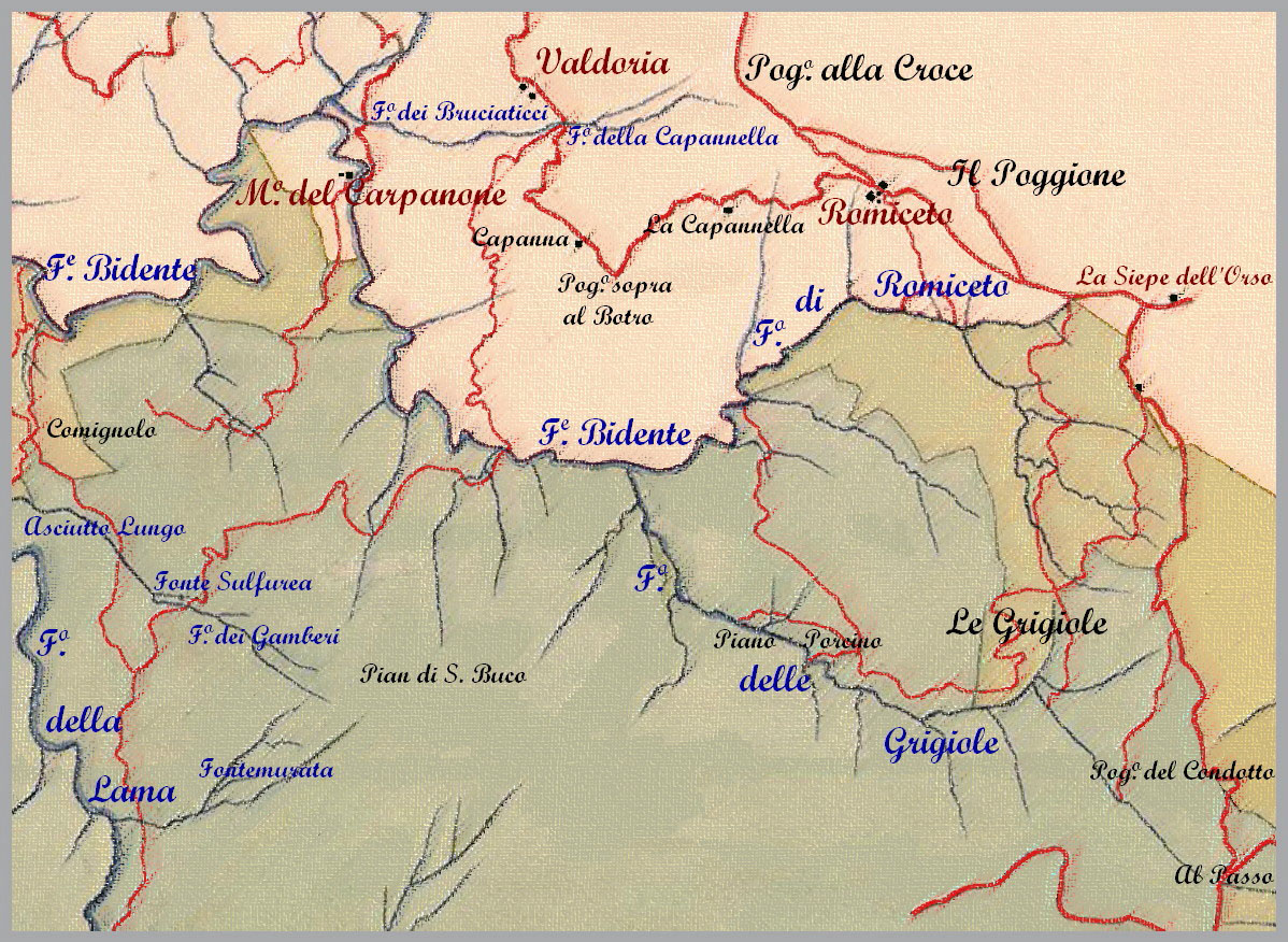 00d4 – Schema da mappa di metà Ottocento; mentre si registra una maggiore completezza di riferimenti geografici si nota la macroscopica approssimazione nell’estendere il Bidente a gran parte del Fosso di Romiceto, peraltro ignorando il tratto già allora attribuito al Fosso del Molino (v. mappa precedente), mentre compare il Fosso delle Grigiole, oggi di Ponte Camera.