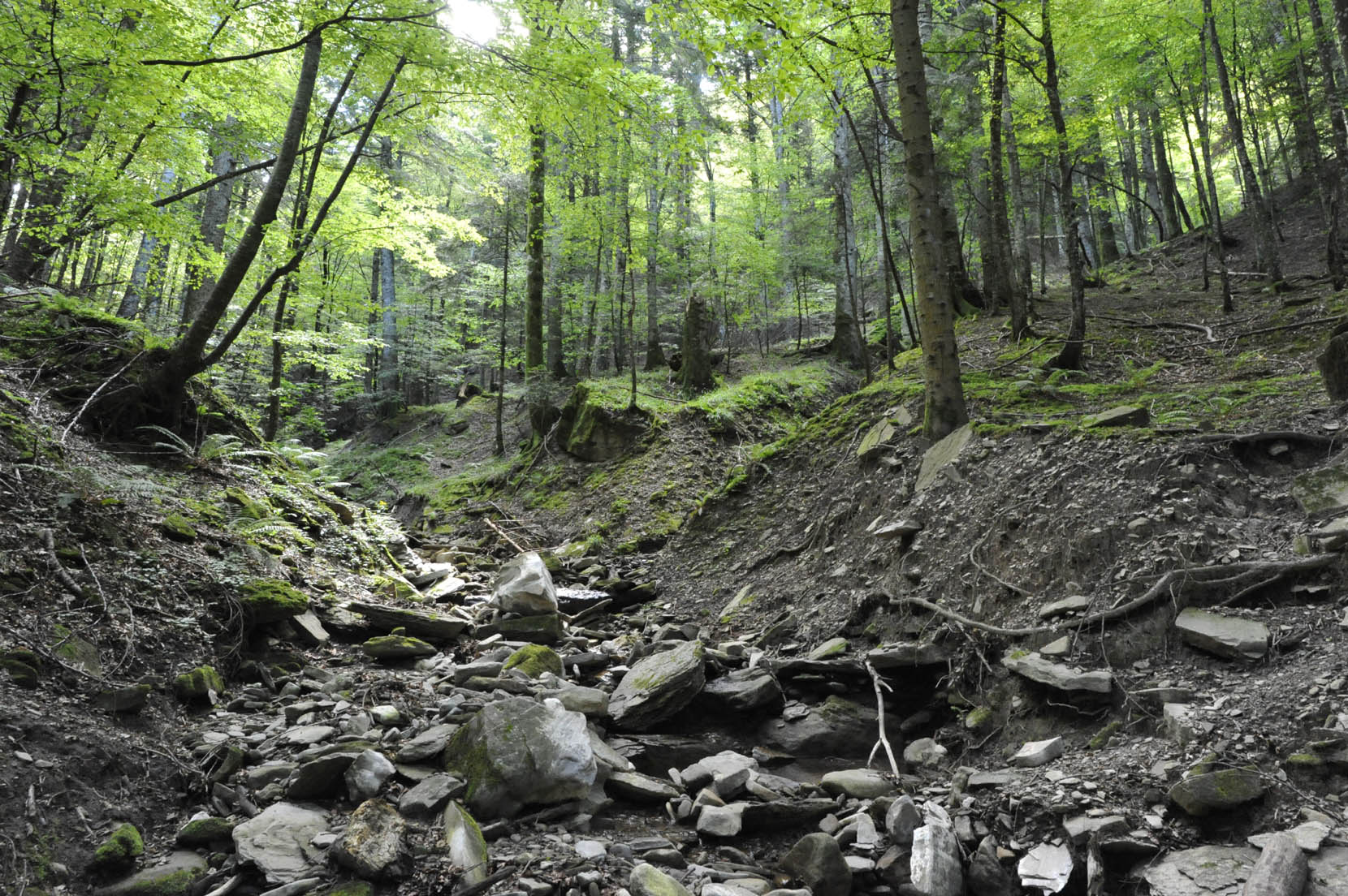 00h12/00h17 - L’anfiteatro di origine del Fosso di Ponte Camera è delimitato dalla dorsale di separazione dal bacino idrografico del Fosso di Romiceto, che staccandosi dal crinale della Bertesca scende alle Grigiole formando un’evidente sella che mostra le tracce di trascorse percorrenze (20/08/20).