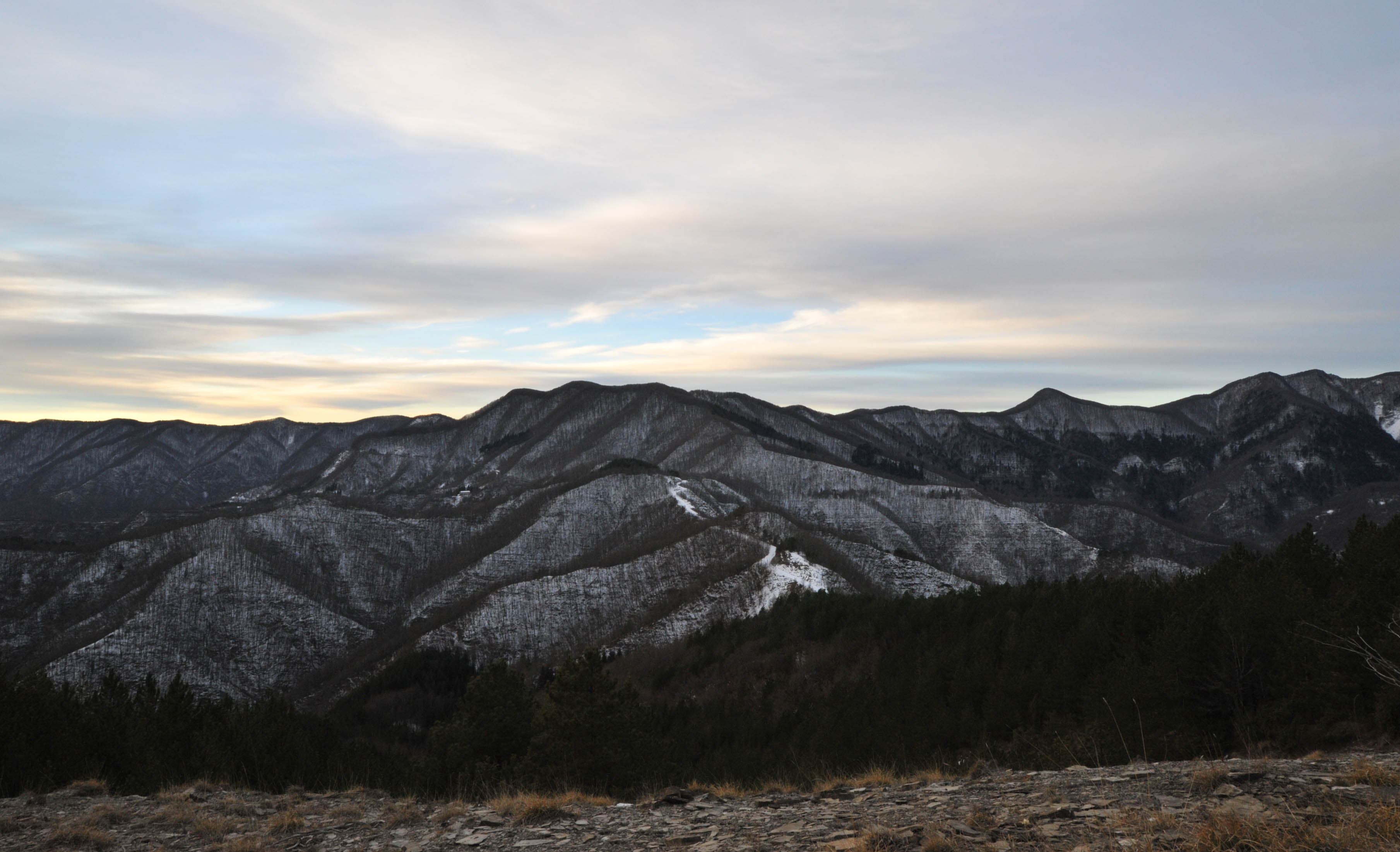 00a1/00a4 - Dal Monte Piano, al centro dell’ampia veduta dello Spartiacque Appenninico pare ergersi particolarmente il complesso montano di Cima del Termine ma la prospettiva occulta gran parte del breve tratto di Spartiacque che comprende i Poggi di Lombardona e dei Mandrioli e che si sviluppa fino al Passo dei Mandrioli, la cui incisione appare con evidenza (1/01/12).