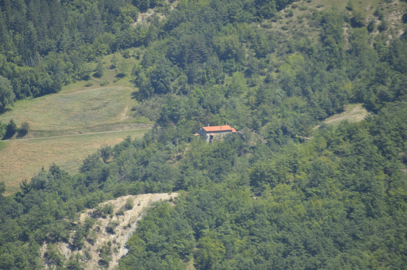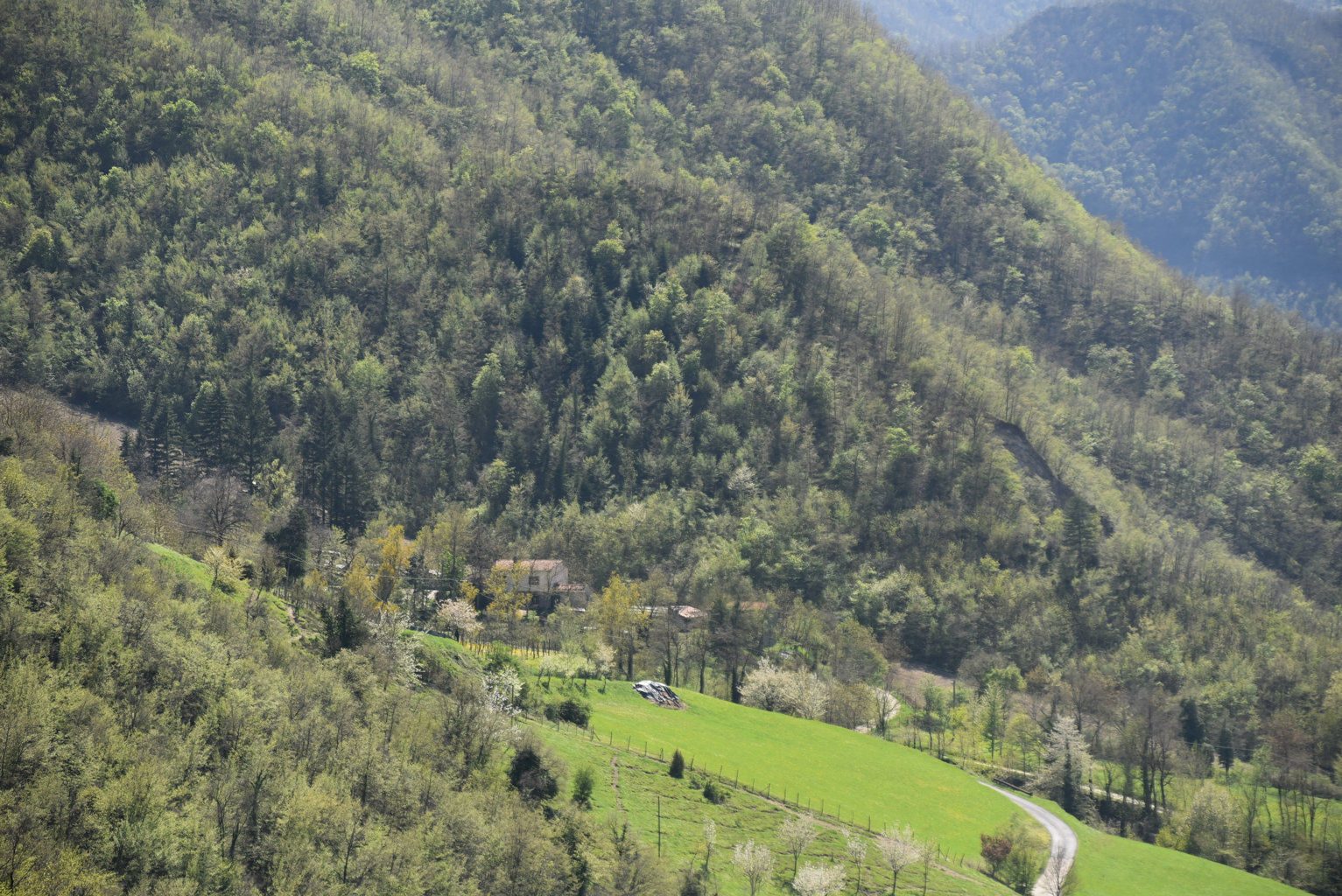 00e1/00e5 - Dalla Valcapria, presso il Fosso di Canforchisio, a monte di Canforchigi, oltre il fondovalle di Ridràcoli vedute della valle del Fosso delle Casine con particolare di C. Monte di Valle di Sopra; si nota il fabbricato storico (28/03/18).