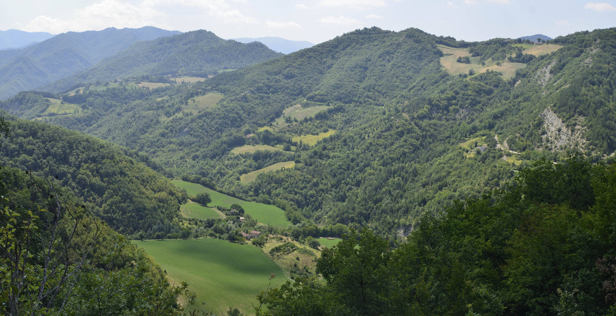 00b1 – 00b2 – Dal versante occidentale del Monte Carnovaletto, panoramica della valle del Bidente di Ridràcoli. Da sx la dorsale del Monte Dragone mostra le prime pendici, con i campi di Farnetino (in p.p.) e Farnetone in corso di rinaturalizzazione; oltre di essa emerge appena la dorsale di Poggio delle Stolle. Oltre il corso del Bidente, segnalato da una fascia boscata, si erge il contrafforte secondario proveniente da Poggio Scali ed ormai al suo termine di Poggio Castellina. La vista prepara alla Val Spugna, della quale però si scorge appena una piccola porzione prativa, mentre si nota il nucleo di Poggiolo, passaggio obbligato già dall’antichità per apprestarsi a superare il fiume e raggiungere Spugna (24/07/18).