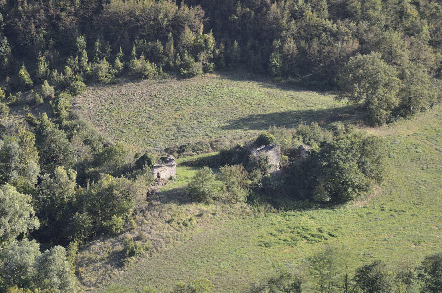 00b3/00b10 – Dalle prime pendici settentrionali della dorsale del Monte Dragone le caratteristiche morfologiche del tratto della valle del Bidente compreso tra le aree poderali di Poggiolo e Spugna appaiono nella loro evidenza; mentre tra la vegetazione si scorge appena il ponte, che aiuta a comprendere il tragitto del percorso viario nel superare lo sbalzo, inalterato nei secoli, ed è evidente il nucleo di Spugna Grande, la vegetazione ricopre i resti di Spugna Piccolo (24/07/18).