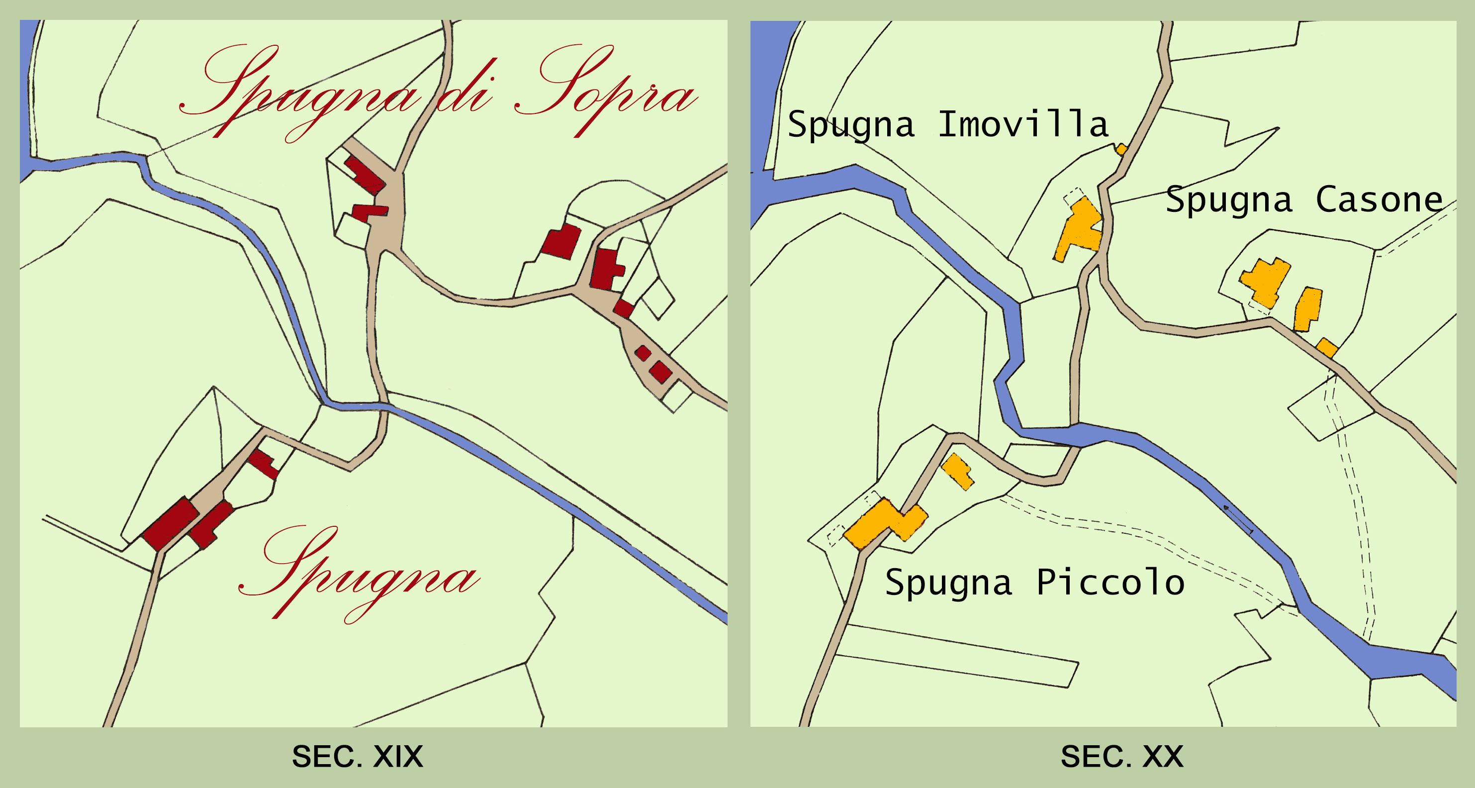 - rappresentato ma anonimo nel Catasto toscano e nella Carta d’Italia I.G.M. (1894), o Spugna nella Carta d’Italia I.G.M. (1937) e in quella moderna, o Spugna Imovilla nel N.C.T., o Imolavilla nella C.T.R.;