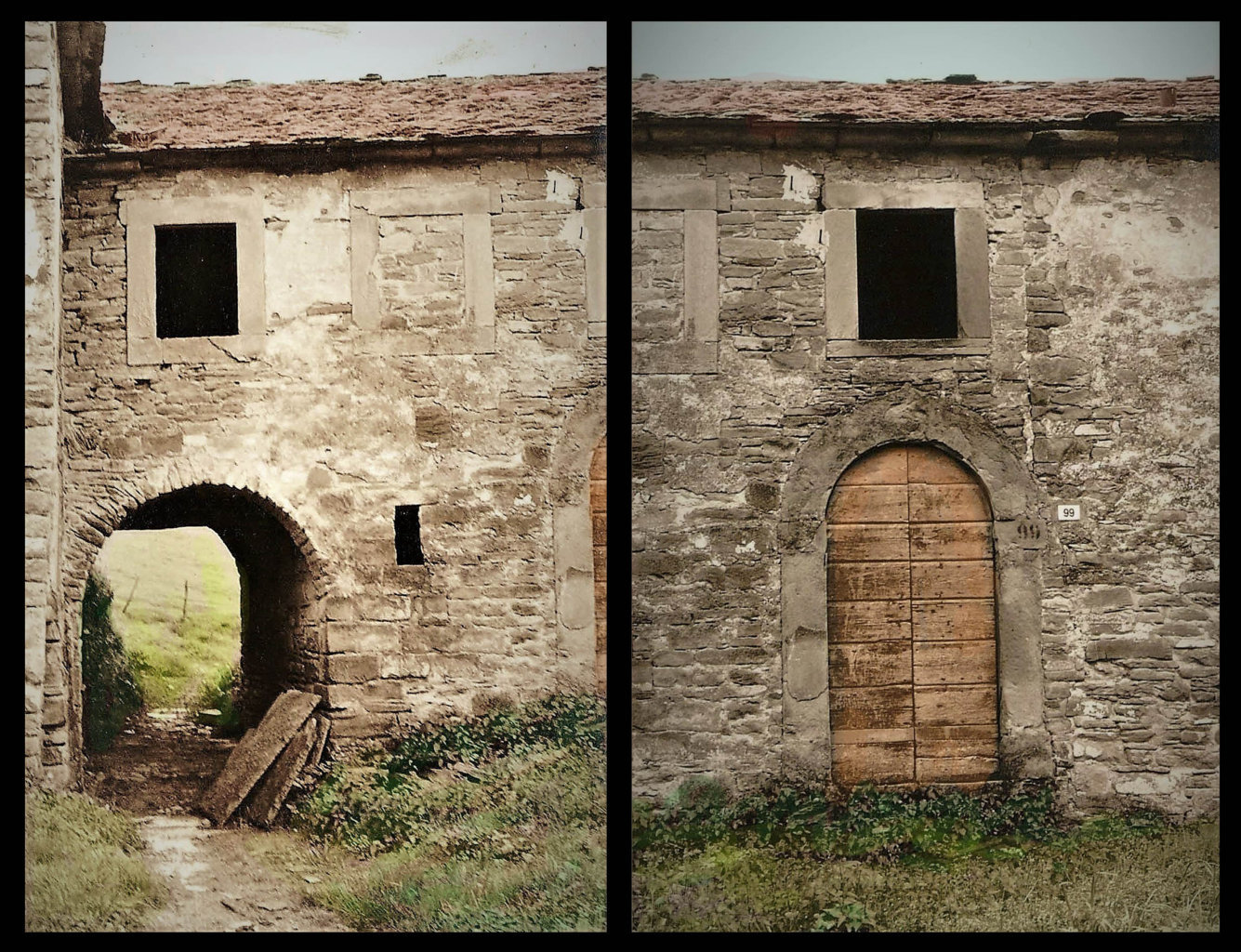 00l2/00l5 – Elaborazioni di particolari di foto b/n degli scorsi Anni ’80, prima degli ultimi crolli, da cui si rilevano le volumetrie e i particolari architettonici di interesse, quali il passaggio coperto archivoltato e il portale ad arco monolitico.