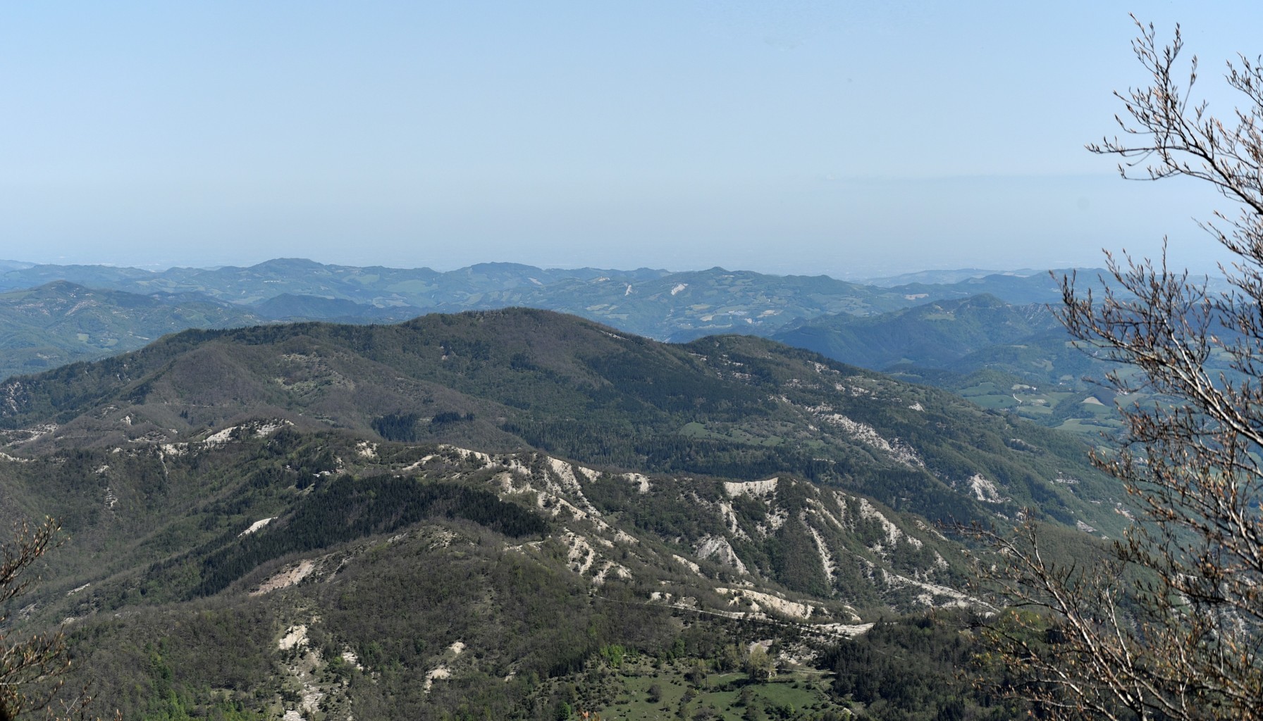 00b1 – 00b2 – Dal crinale appenninico pressi Cima del Termine, scorcio della valle del Bidente di Pietrapazza e Strabatenza che si incunea sotto il contrafforte di cui si notano i Monti Marino e Pezzoli e Poggio Busca, con particolare del versante del Pezzoli con i campi che da Montepezzolo scendono fino a La Crocetta, prospetticamente preceduti da quelli di Pratalino (3/10/11).