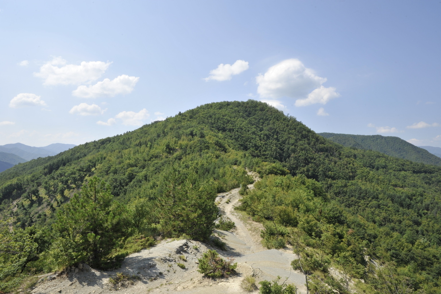 00m1 – 00m2 – 00m3 – Da Raggiolo il Monte Pezzoli appare acuminato; si nota inoltre il taglio della S. Vic.le Poggiolo-Valle fino a Poggio Busca (24/07/18).