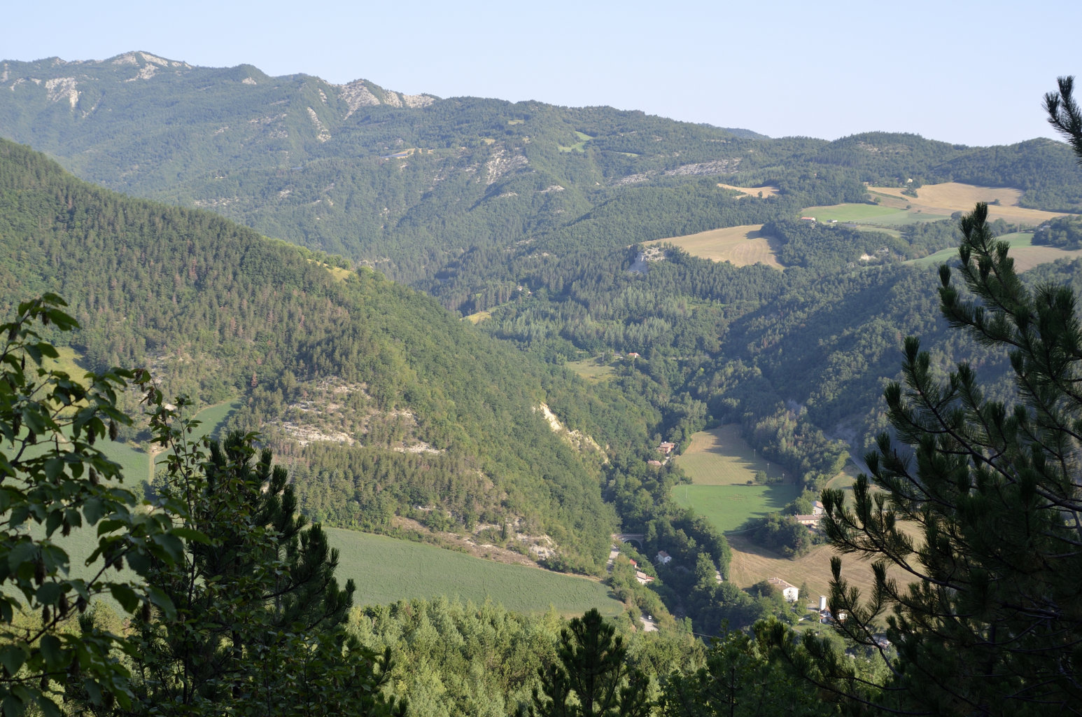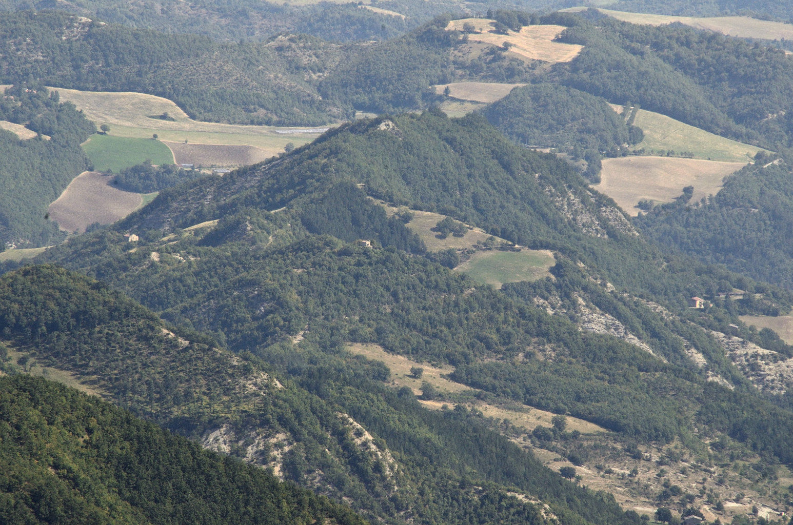 00a1/00a4 - Da Poggio Aguzzo si percepisce lo sviluppo della valle da Corniolo verso lo sbarramento del contrafforte, che costringe il fiume compiere il “periplo” di Poggio Castellina, cui segue quel simmetrico ed ampio semianello, precedente S.Sofia, dove confluiscono il Bidente di Ridràcoli ed il Bidentino. Del contrafforte appare il tratto finale da Poggio Collina a Poggio Castellina (la cui vetta si confonde con quella del Monte Carnovaletto) e si riconoscono i tratti topici nonostante la deformazione prospettica. Aiuta l’indice fotografico: Uccellara e Pod. Collina sono poco oltre il crinale (25/04/18).