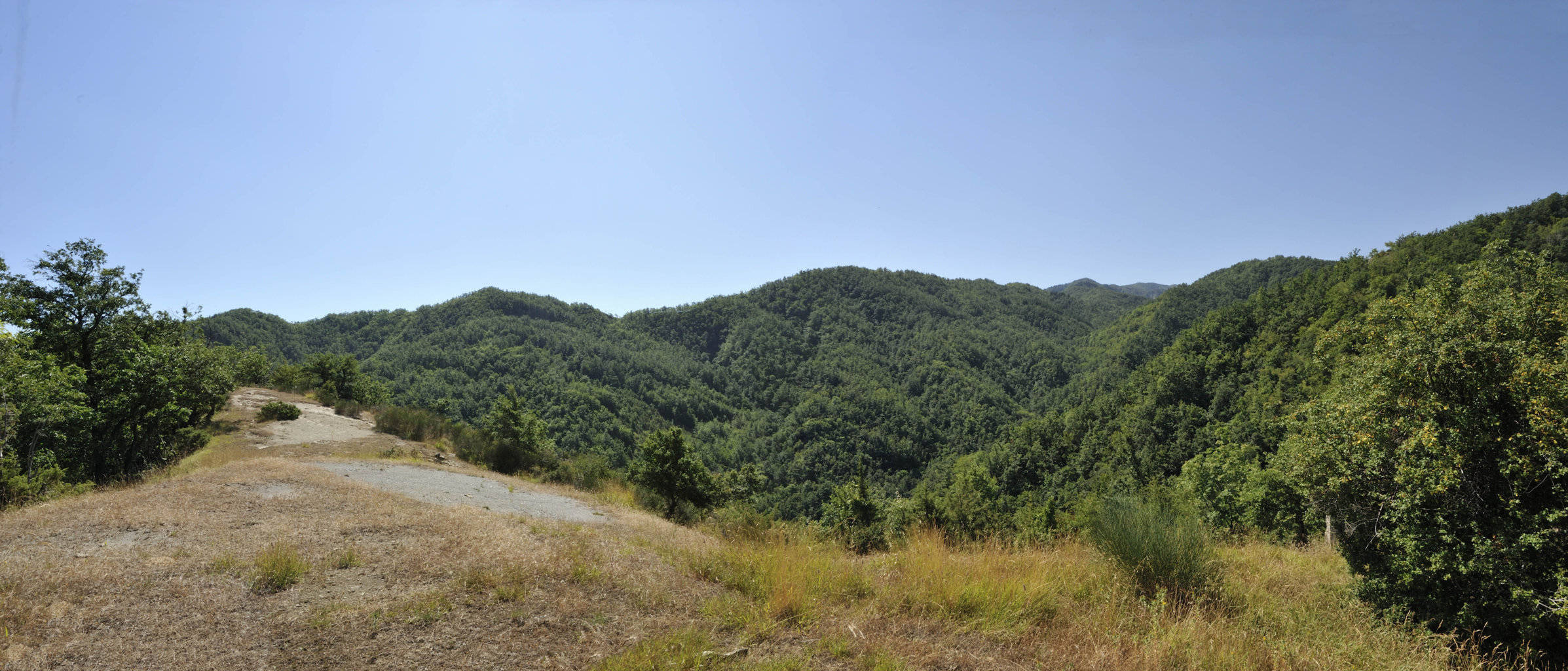 00a1/00a5 – Dal Monte Piano, sul contrafforte principale che si stacca da Cima del Termine, panoramica del pressoché intero contrafforte secondario, che, staccandosi dallo Spartiacque Appenninico a Poggio allo Spillo, si scorge fino a Monte Pezzoli: il complesso vallivo del Fosso del Trogo rimane però defilato e parzialmente occultato dal crinale del Monte Roncacci (nell’indice fotografico le frecce indicano gli insediamenti celati alla vista) (1/10/12).