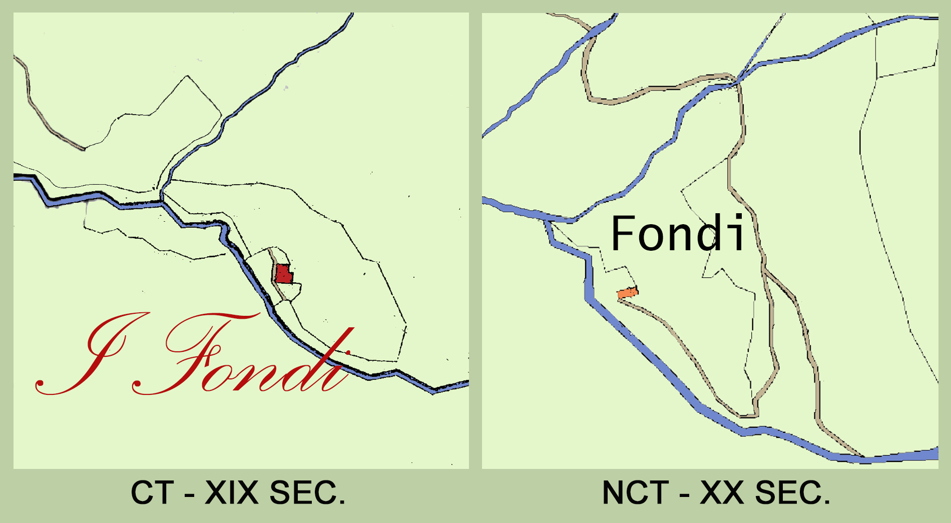 00c2 – 00c3 - Schema da mappa catastale della prima metà dell’Ottocento relativo alla valle del Latricheto, evidenziante il sistema insediativo, con utilizzo della toponomastica originale. Qui compare anche la toponomastica della viabilità principale di fondovalle e di crinale. Integrazioni in corsivo moderno a fini orientativi. Confronto schematico tra catasto antico e moderno da cui si rilevano le modifiche planimetriche intercorse nell’ultimo secolo di utilizzo del fabbricato, tra cui l’abbandono della via che da Lastricheto scendeva verso il fosso.