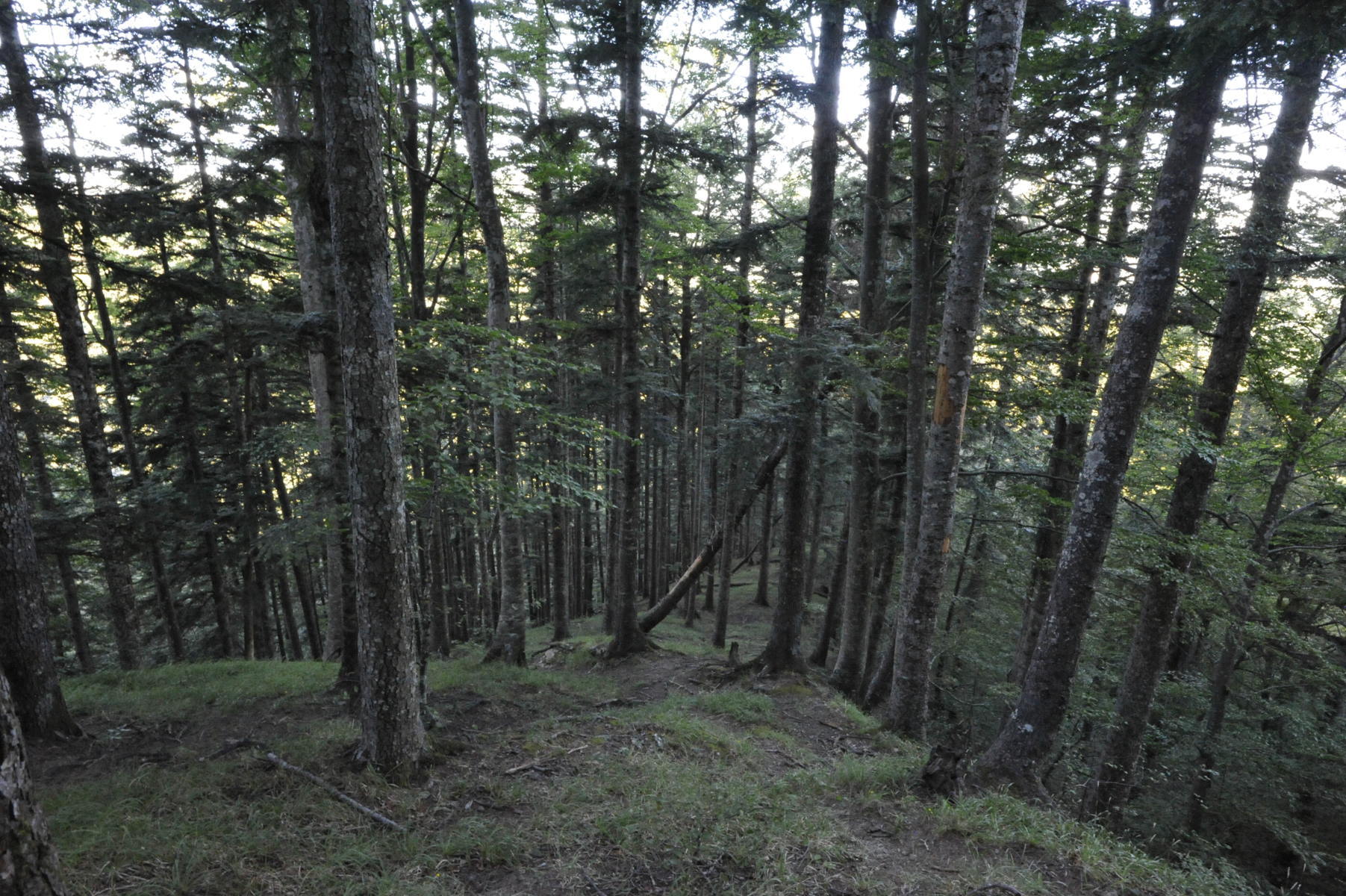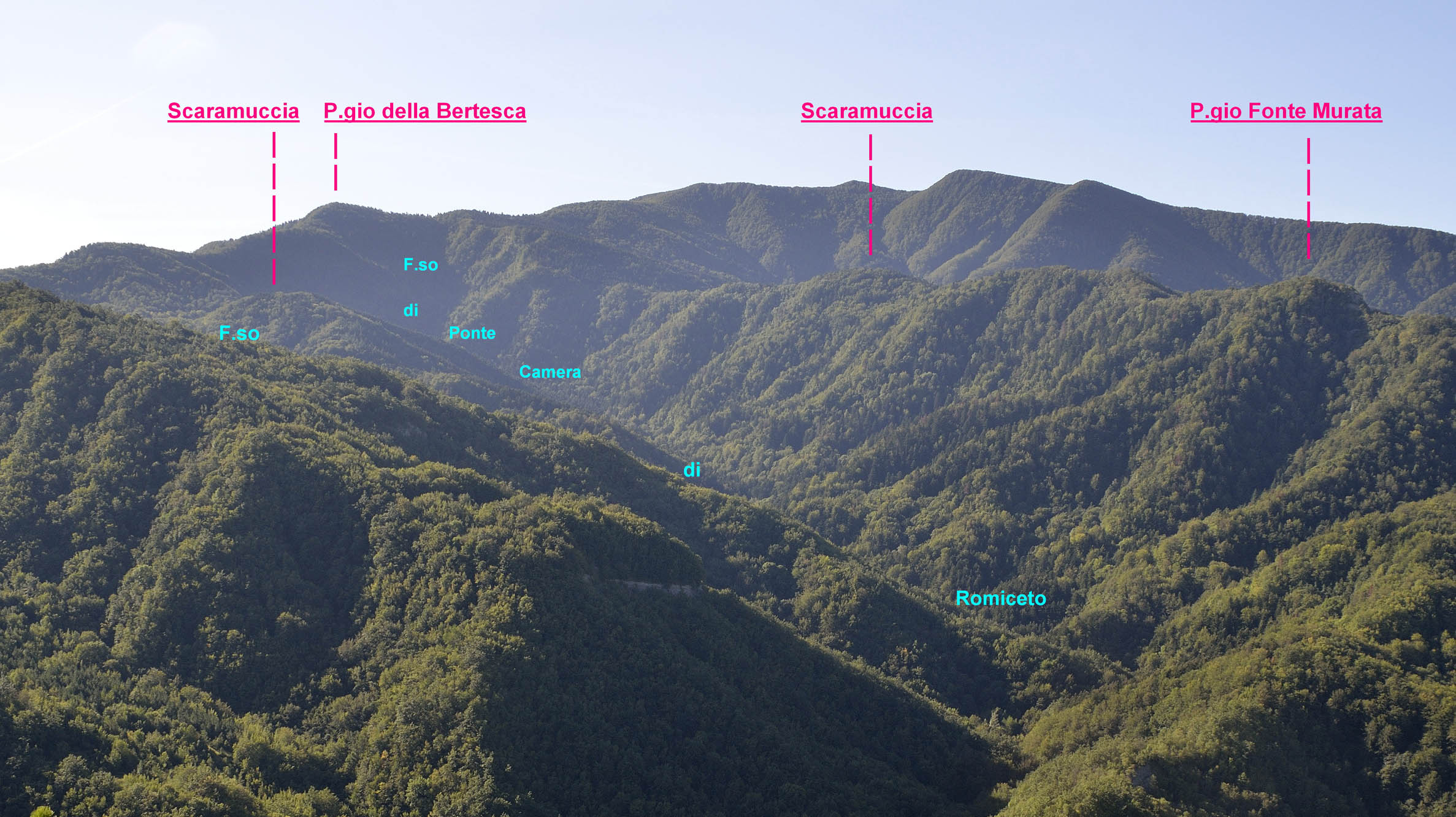00b1/00b5 – Dall’alta quota del Monte Cerviaia si ha la veduta più elevata verso lo Spartiacque Appenninico e le dorsali che vi si distaccano, separate dalle profonde incisioni del reticolo idrografico, utili per individuare la localizzazione dei siti topici della Giogana e il sistema di dorsali che delimitano le valle dei Fossi di Romiceto e ponte Camera, con particolare di Scaramuccia che spunta oltre la dorsale che discende dal poggio di Croce di Romiceto. Si notano i picchi omonimi di Scaramuccia sui crinali degli opposti versanti e la sella dove sorge il fabbricato delle Grigiole. L’indice fotografico agevola nel riconoscimento dei luoghi. è evidenziata la traccia della S.F. del Cancellino; la croce segnala il sito di Croce Fabbri, dove si stacca il sentiero di crinale per il Molino di Carpanone (28/08/18).