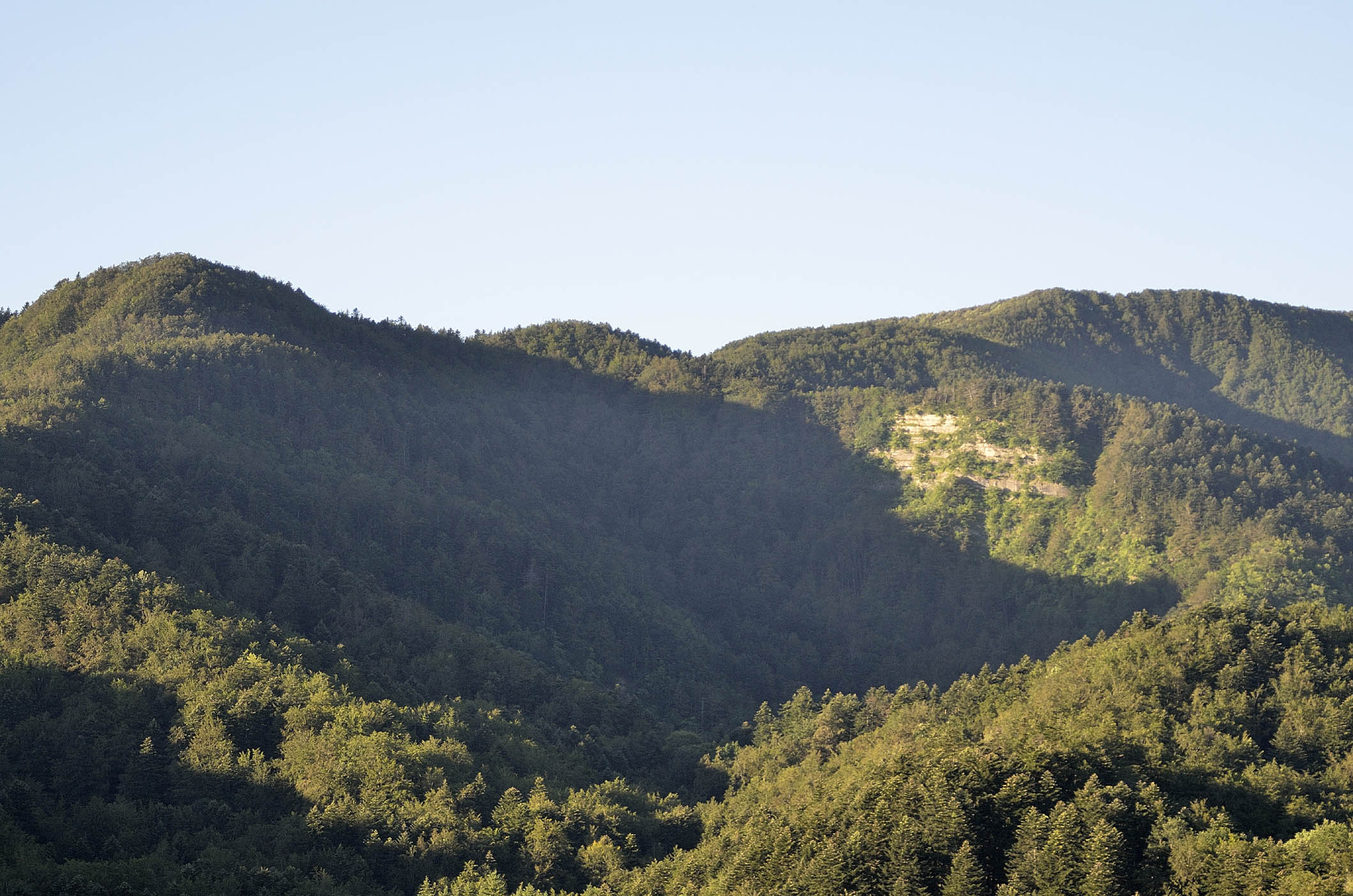 00a1 – 00a2 – 00a3 - Dal Belvedere Bocab, sulla S.F. S.Paolo in Alpe-La Lama, oltre la valle del Fosso delle Macine ancora in ombra e la dorsale che si stacca da Poggio Scali, il primo sole illumina il contrafforte della Bertesca e, delimitate dai vari rilievi, le valli dei Fossi di Romiceto e Ponte Camera tra le quali si alza la modesta dorsale che esprime il picco di Scaramuccia, oltre il quale si cela il fabbricato de Le Grigiole, qui poco distinguibile (18/12/16).