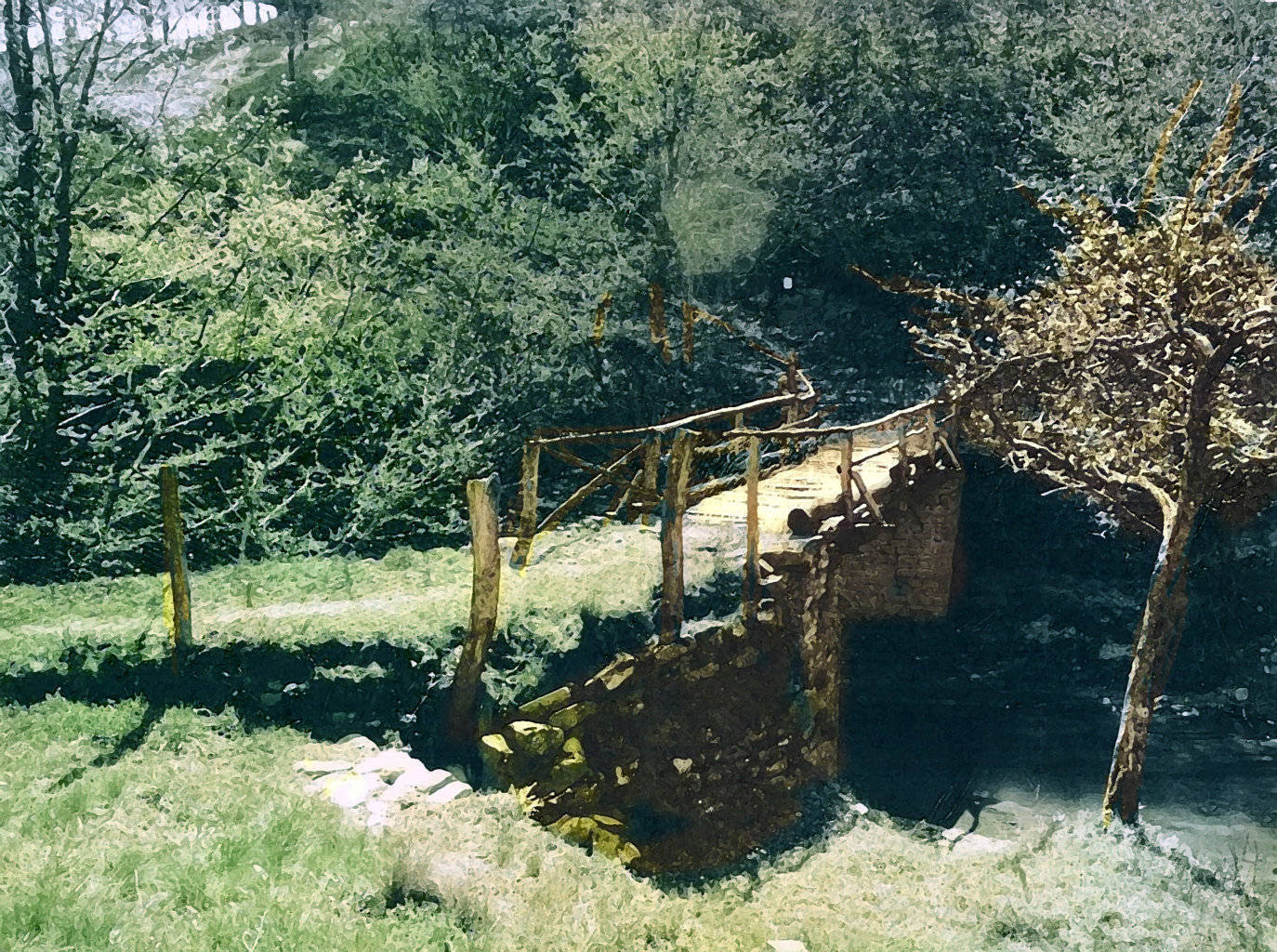 00e1 – 00e2 – 00e3 – Elaborazioni pittoriche tipo olio ispirate a foto degli anni ’70, quando il ponte era ancora costituito secondo le vecchie regole ovvero da tre tronchi poggianti su spalle laterali in pietrame a secco e tavolato protetto da un manto di pietrisco e parapetto in legno.
