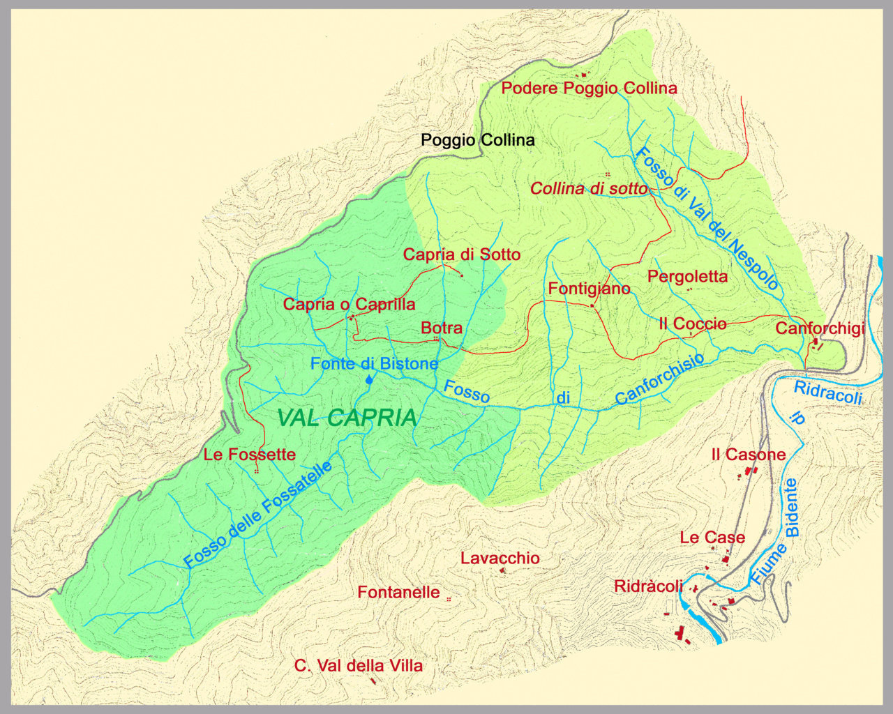 Testo di Bruno Roba (2/06/2019 - Agg. 23/02/2024) - La Valle del Fosso di Canforchisio, ricomprendente la Valle di Capria, si articola in quella principale e nelle valli dei suoi affluenti, che di fatto possiedono autonomia morfologica, la valle del Fosso delle Fossatelle, interamente ricompresa nella Valle di Capria, e la valle del Fosso di Val del Nespolo. Il Fosso di Canforchisio ha origine dal tratto di contrafforte che precede Poggio Collina e sbocca nel Bidente presso Canforghigi, il Fosso delle Fossatelle (detto delle Fossette nel Catasto toscano) ha origine dalla biforcazione della dorsale dopo lo snodo di Ronco dei Preti e confluisce nel Fosso di Canforchisio presso la Fonte di Bistone, il Fosso di Val del Nespolo (c.d. nel Catasto toscano) ha origine subito dopo Poggio Collina e sbocca nel Fosso di Canforchisio poco prima della sua confluenza nel Bidente.