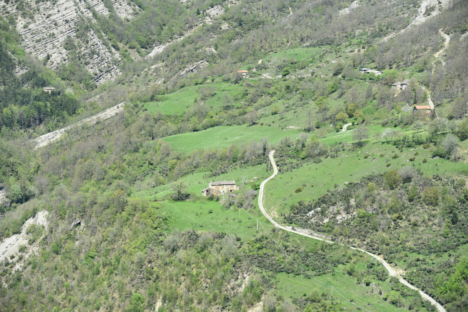 Testo di Bruno Roba - Dalla S.P. 4 del Bidente, giunti a Lago, prima del ponte si imbocca la rotabile che risale il Bidente delle Celle. Dopo meno di 100 m si trova un bivio con una rotabile (privata e chiusa da una sbarra) che risale sulla dx solo in parte ricalcante antichi tracciati viari collegando i vari poderi raggiungendo per prima C. S.Giovanni, + 700 m. Proseguendo la salita tra tornanti verso E la pista termina a Capo alla Villa, + 500 m. Si inverte la direzione sula pista verso NO e si trova subito Ciortino, + 90 m poi Ca’ d’Armati, + 110 m. Qui da un bivio si imbocca una pista che transita davanti ad un capannone agricolo e dopo due tornanti si dirige rettilinea e senza incertezze in costante risalita verso Pian dell’Olmo per 1 km, perdendo per l’abbandono e l’erosione i caratteri di pista e riacquistando quelli di mulattiera. Da Ca’ d’Armati la pista prosegue in piano fino a Ca’ d’Orso, + 300 m, quindi la mulattiera corrispondente alla via antica arriva a Ca’ di Belletta, + 300 m. A La Casina conviene arrivare dalla rotabile di fondovalle lasciandola a circa 500 m da Lago, appena oltrepassato lo sbocco del Fosso della Fontaccia, dove oltre un’eventuale recinzione con passo si risale nel podere abbandonato, + 50 m.