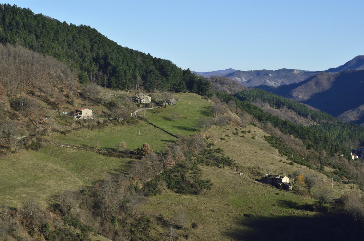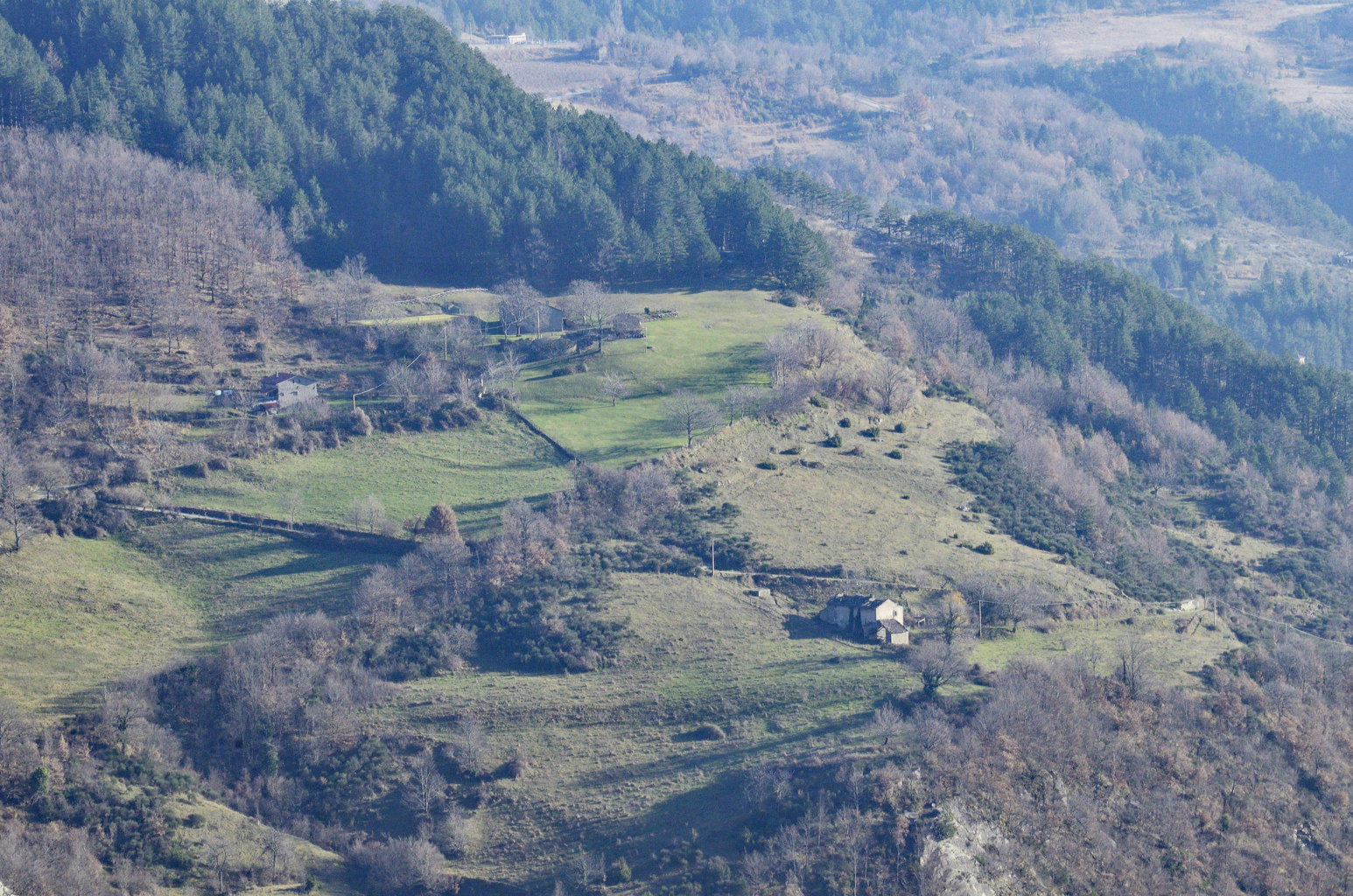 00e1/00e4 – Dal poggio del Castellaccio del Corniolino, scorcio dei prati-pascoli dove si notano allineati Ca’ d’Armati, Ciortino e Capo la Villa mentre il sito di S.Giovanni è seminascosto in basso (13/12/16).