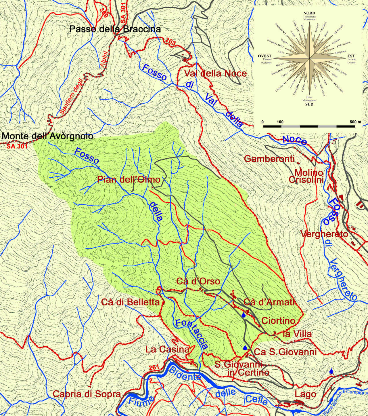 L’ultima valle di questo versante del Bidente delle Celle è attraversata dal Fosso della Fontaccia, anch’essa caratterizzata da un ampio versante esposto a solatìo che si innalza fino al crinale della sopracitata dorsale di Pian dell’Olmo, in parte soggetta a fenomeni geomorfologici da scivolamento di detrito di versante incoerente, di dimensioni e litologie varie depositato per gravità e ruscellamento, costituente paleofrana risalente al Quaternario, Pleistocene superiore-Olocene (1,8 milioni - 10 mila anni BP, Before Present, anni dal presente, inteso per convenzione il 1950). Il versante a bacìo scosceso e dirupato appartiene alla dorsale che si stacca dal Monte dell’Avòrgnolo, interposta con la Valle di Lavacchio. Il Fosso della Fontaccia ha origine dalla biforcazione creata da dette due dorsali nello staccarsi dal monte e si immette nel Bidente delle Celle, a circa 500 m in linea d’aria da Lago, parzialmente intubato a seguito della costruzione della rotabile che risale il Bidente fino agli impianti di adduzione dell’invaso di Ridràcoli. Sul bordo superiore settentrionale e/o all’interno dei prati-pascoli della paleofrana si distribuiscono gran parte degli insediamenti, o ne debordano fino a raggiungere gli 800 m di quota, alcuni abbandonati e diruti, altri recuperati ed abitati. Essi sono Ca’ d’Armati già Casa Armai e forse Cà D’Amati, Ca dell’Orso o Ca’ dell’Orso o Cà D’Orso, già Cas’Orso o l’Orso, Ca di Belletta già Casabelleta, Ca S. Giovanni o Ca’ S. Giovanni o C. S. Giovanni già Giovanni, Ciortino documentato già Certino, Capo alla Villa già Capo la Villa, anticamente centro amministrativo di tutta la zona, Pian dell’Olmo e La Casina, quest’ultimo toponimo noto solo nel luogo e tramandato oralmente. Va inoltre ricordata l’antica e scomparsa Chiesa di S. Giovanni in Certino, parrocchiale documentata dal 1378 di cui conserva memoria toponomastica il vicino fabbricato di S. Giovanni, mentre il diffuso toponimo Certino è una contrazione da cerretino dal latino cerretum, bosco di cerri, anch’esso antico e diffuso toponimo, documentato dalla CARTA GEOGRAFICA DELLA DIOCESI DI S. ILLARO del 1754-59 (cfr. Carta del territorio dell’abbazia di S.Ellero, tav. f.t. in: E. Agnoletti, 1974, cit.), unico toponimo riportato nell’area specifica insieme a Vergareto, ma già allora non accompagnato dalla simbologia crociata utilizzata in caso di presenza di strutture religiose.