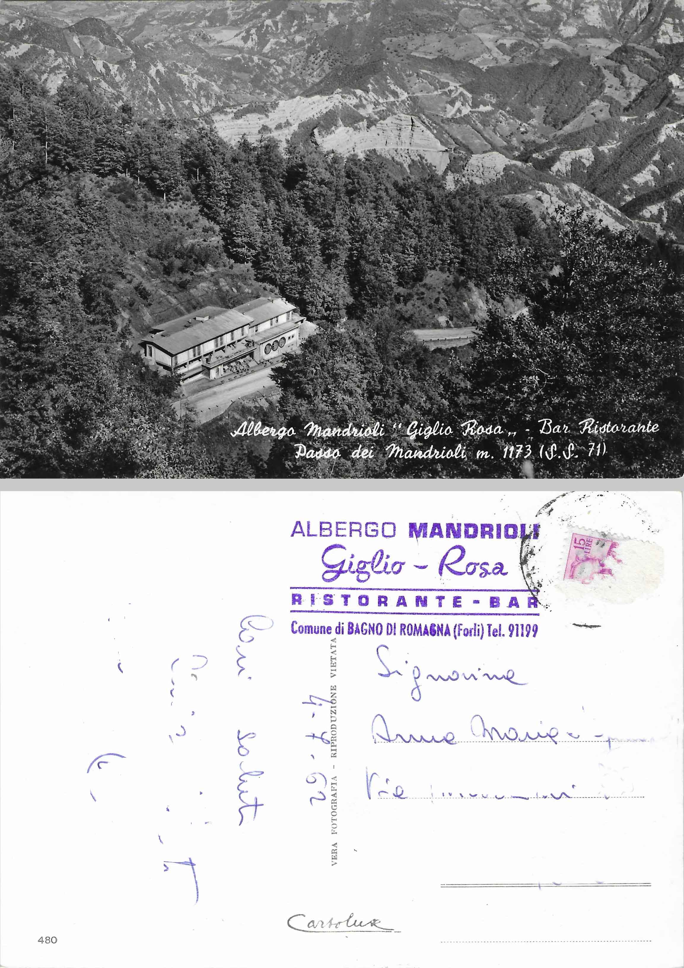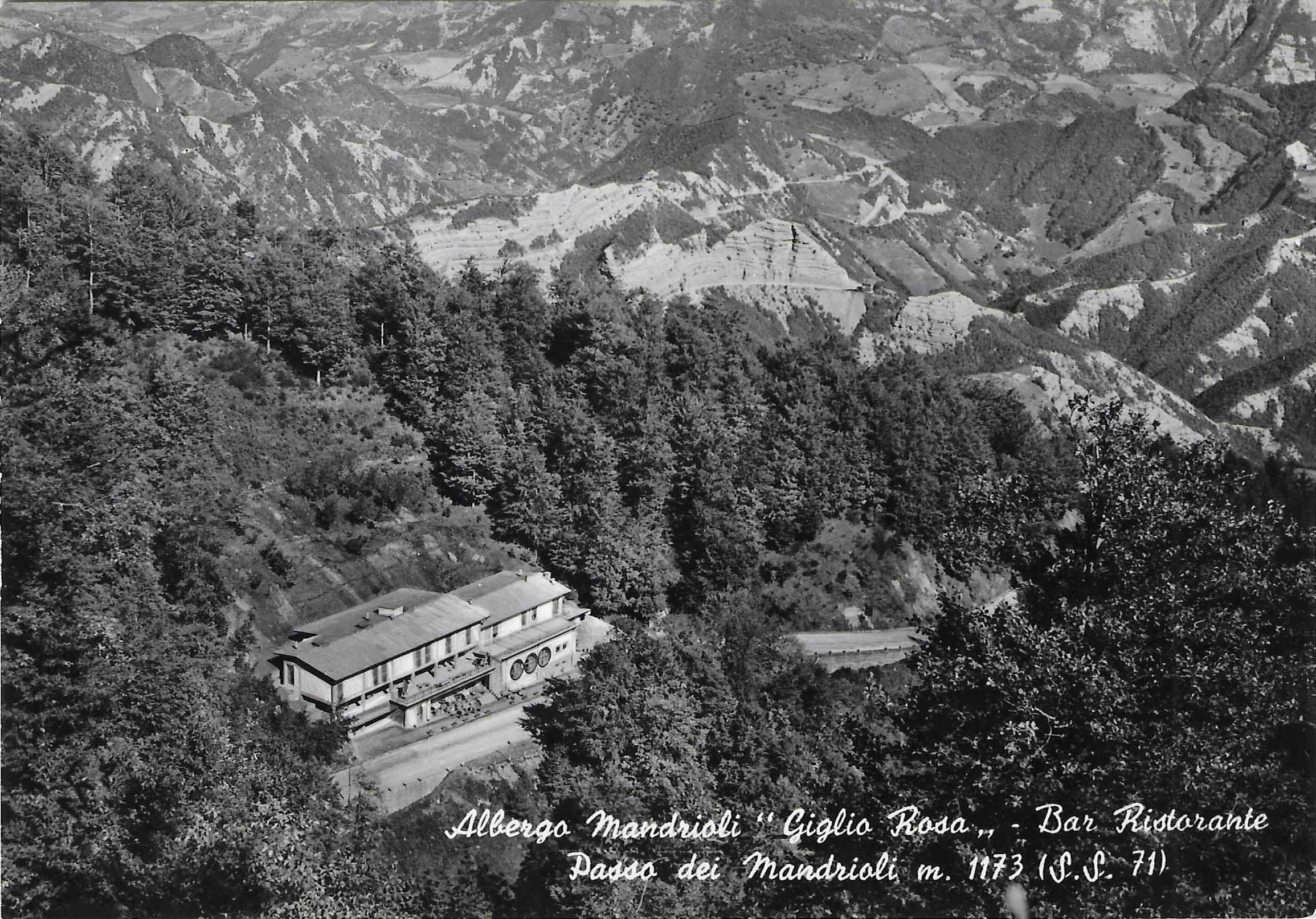 012 - 013 – Cartolina Albergo Mandrioli “Giglio Rosa” – Bar Ristorante – Passo dei Mandrioli m.1173 (S.S. 71), viaggiata nel 1962 con timbro sul retro e veduta dall’alto dell’albergo ripresa da Cima del Termine, quando il bosco meno fitto lo consentiva; la cartolina ha il n. di serie 480 ed è edita dalla Cartolux, fondata da Torquato Nanni Jr., che già negli Anni Trenta e Quaranta andava in giro per la Romagna a fotografare, come ricordano le figlie (collezione personale).