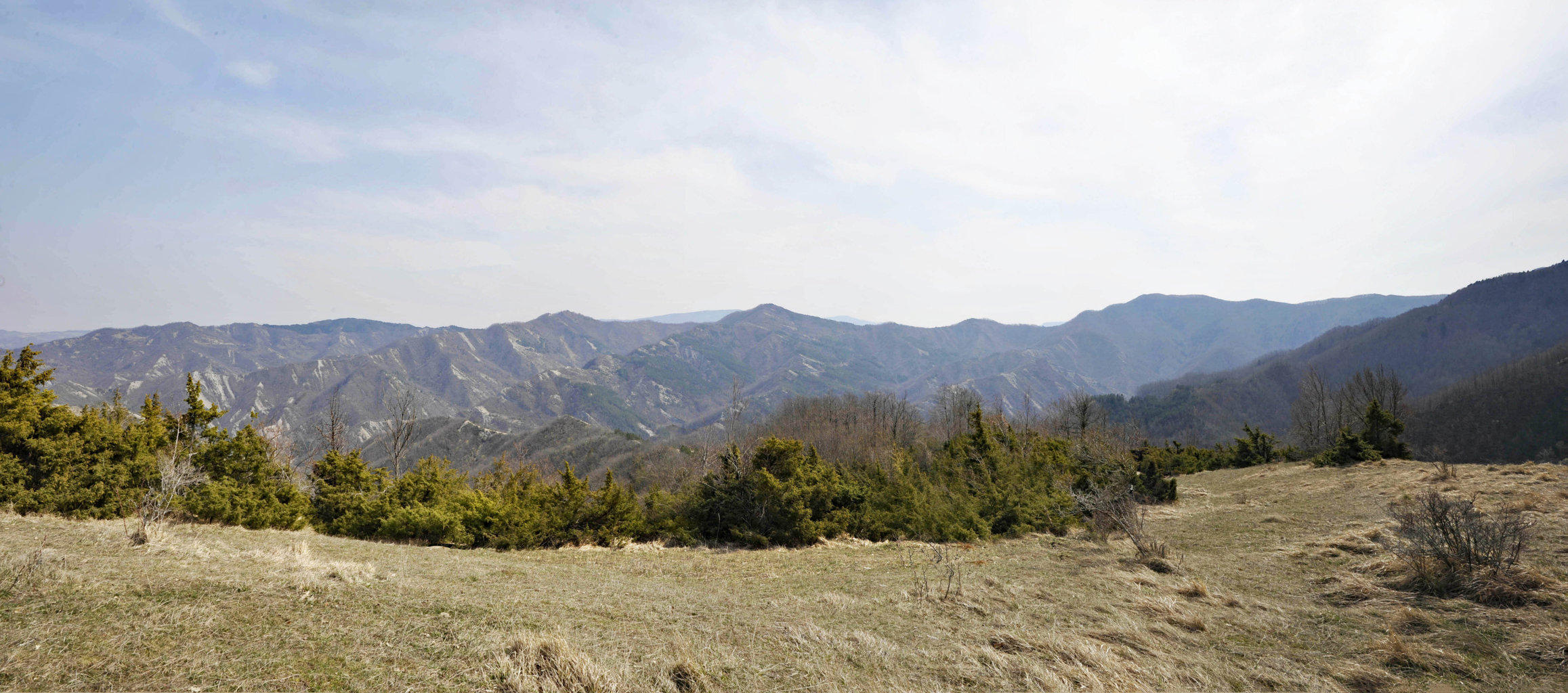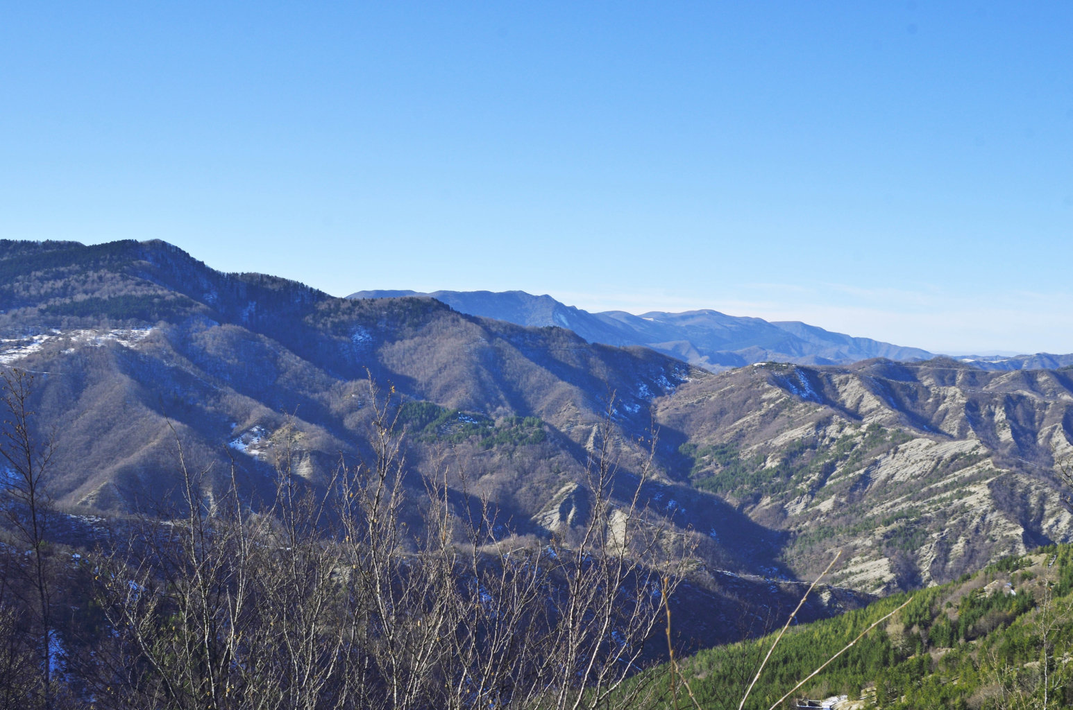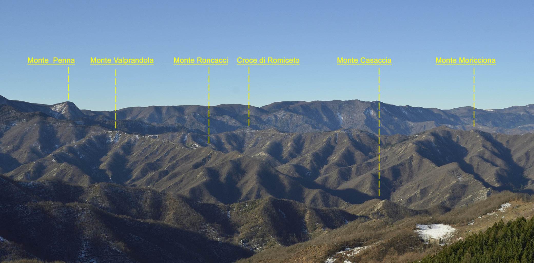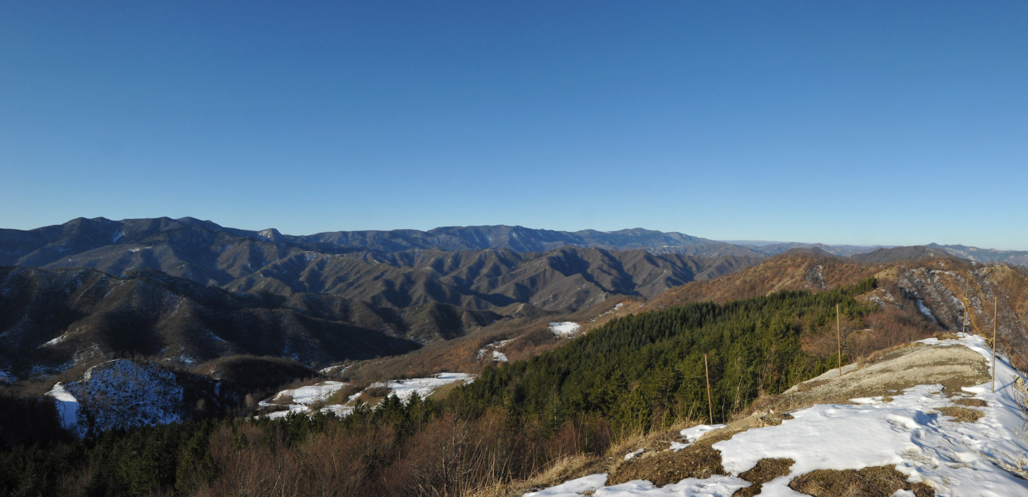 00a1/00a5 - Dal Monte Piano si può avere una delle più ampie panoramiche dell’intero Spartiacque Appenninico e del contrafforte secondario che si stacca da Poggio allo Spillo/Passo della Crocina, con vedute del crinale della Bertesca, del Monte di Valprandola e sue diramazioni, con indici fotografici (1/01/12).