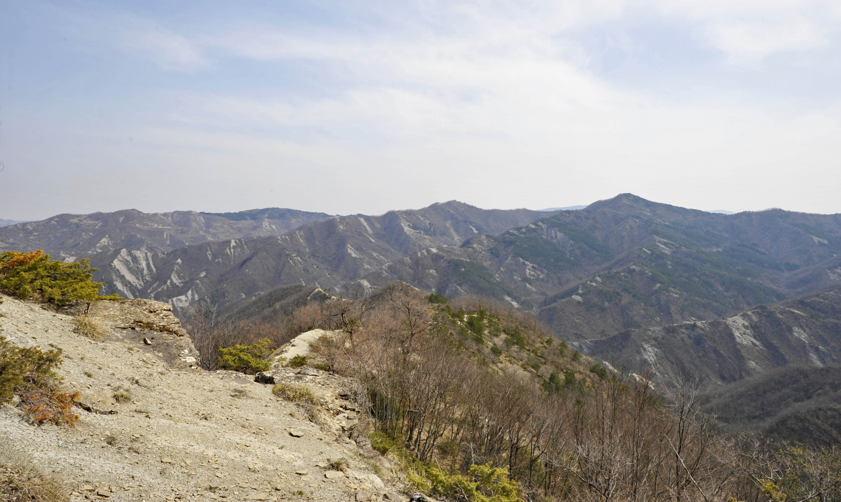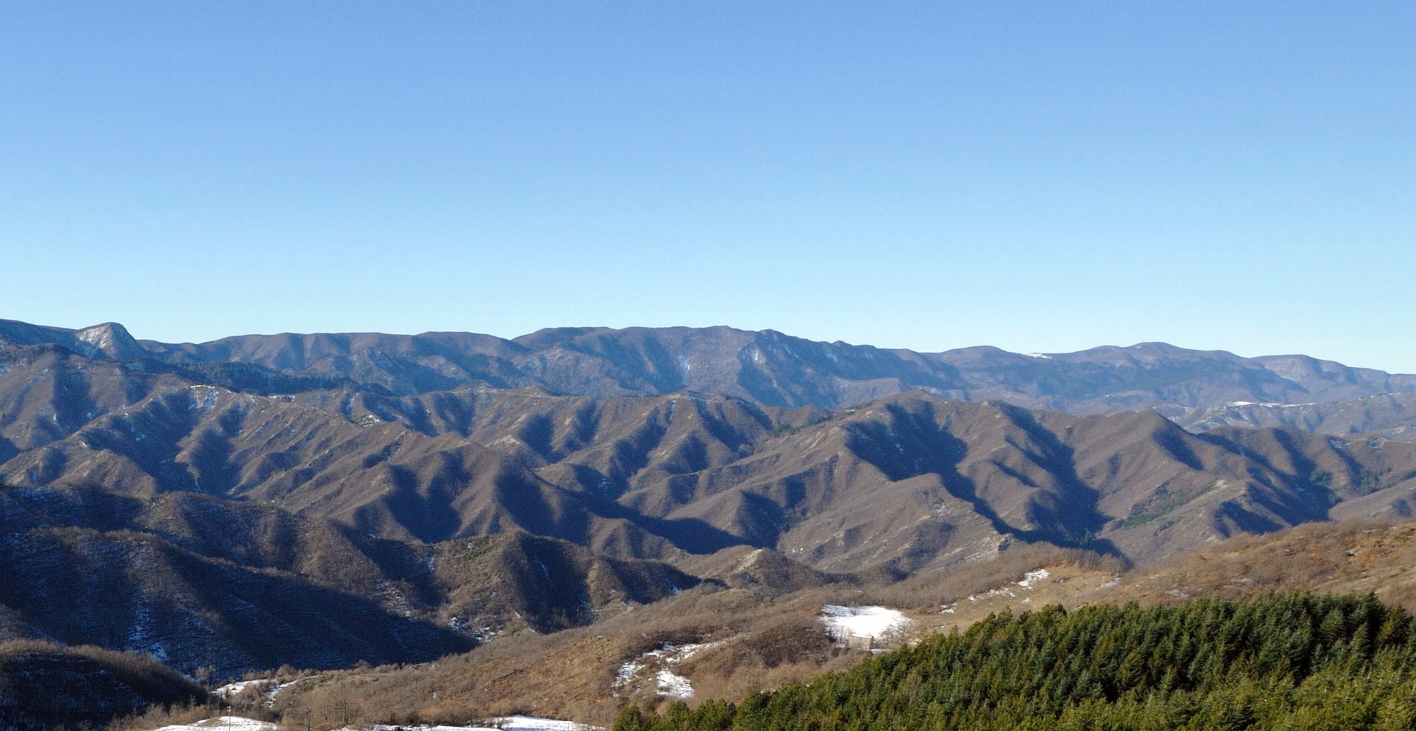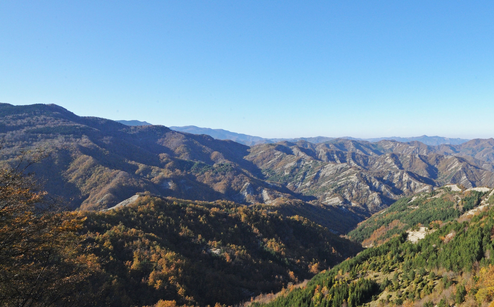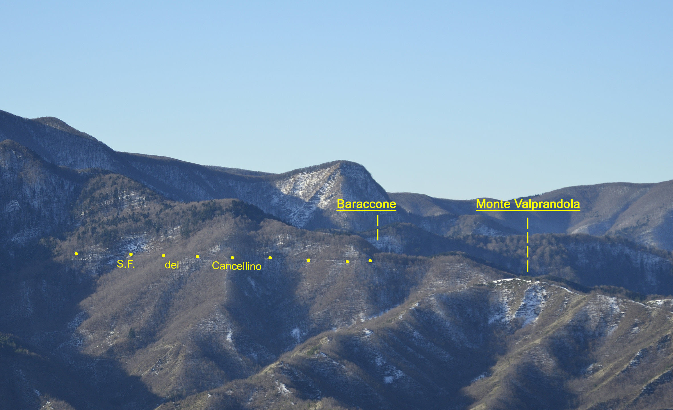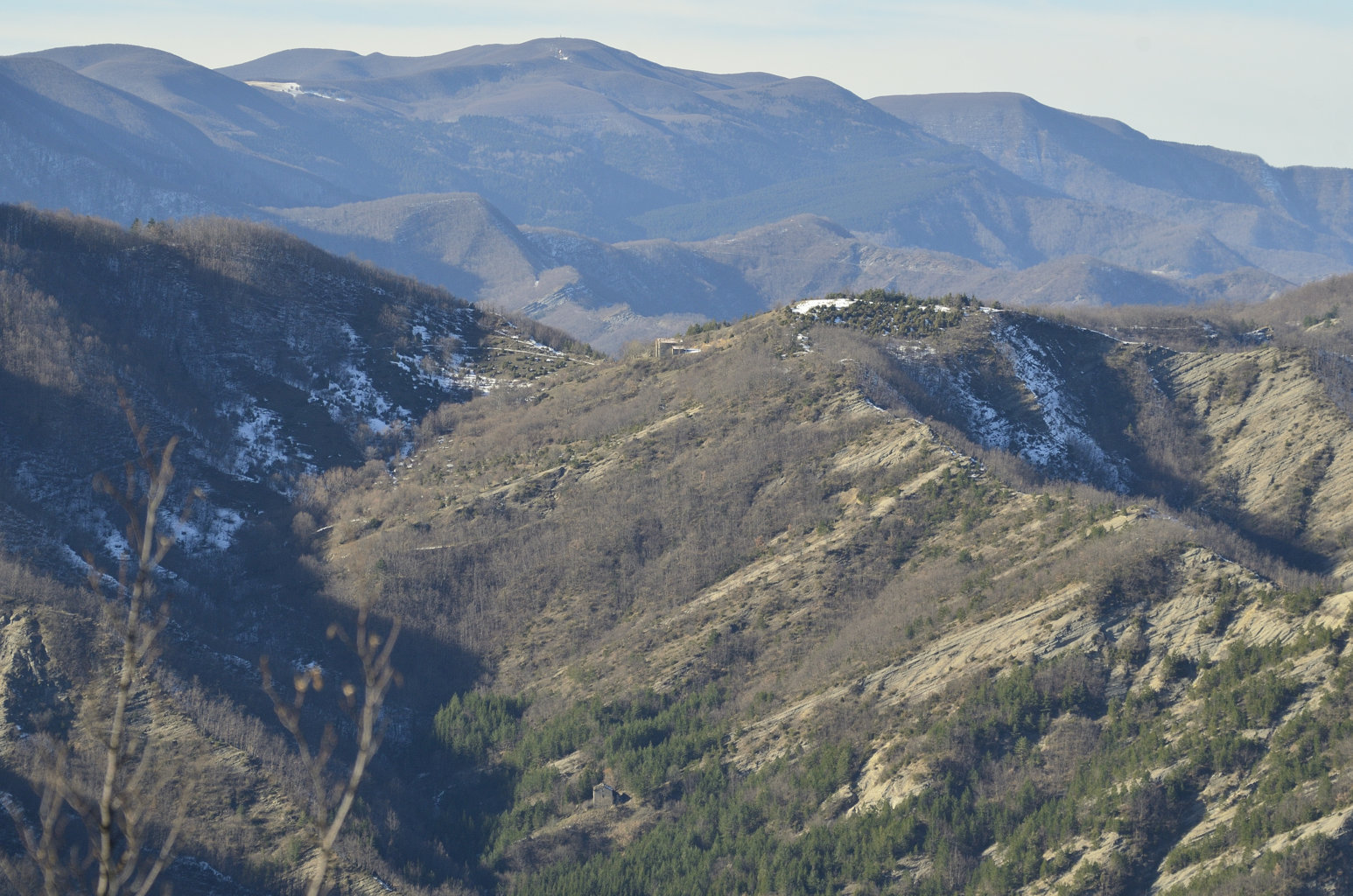 00a1/00a5 - Dal Monte Piano si può avere una delle più ampie panoramiche dell’intero Spartiacque Appenninico e del contrafforte secondario che si stacca da Poggio allo Spillo/Passo della Crocina, con vedute del crinale della Bertesca, del Monte di Valprandola e sue diramazioni, con indici fotografici (1/01/12).