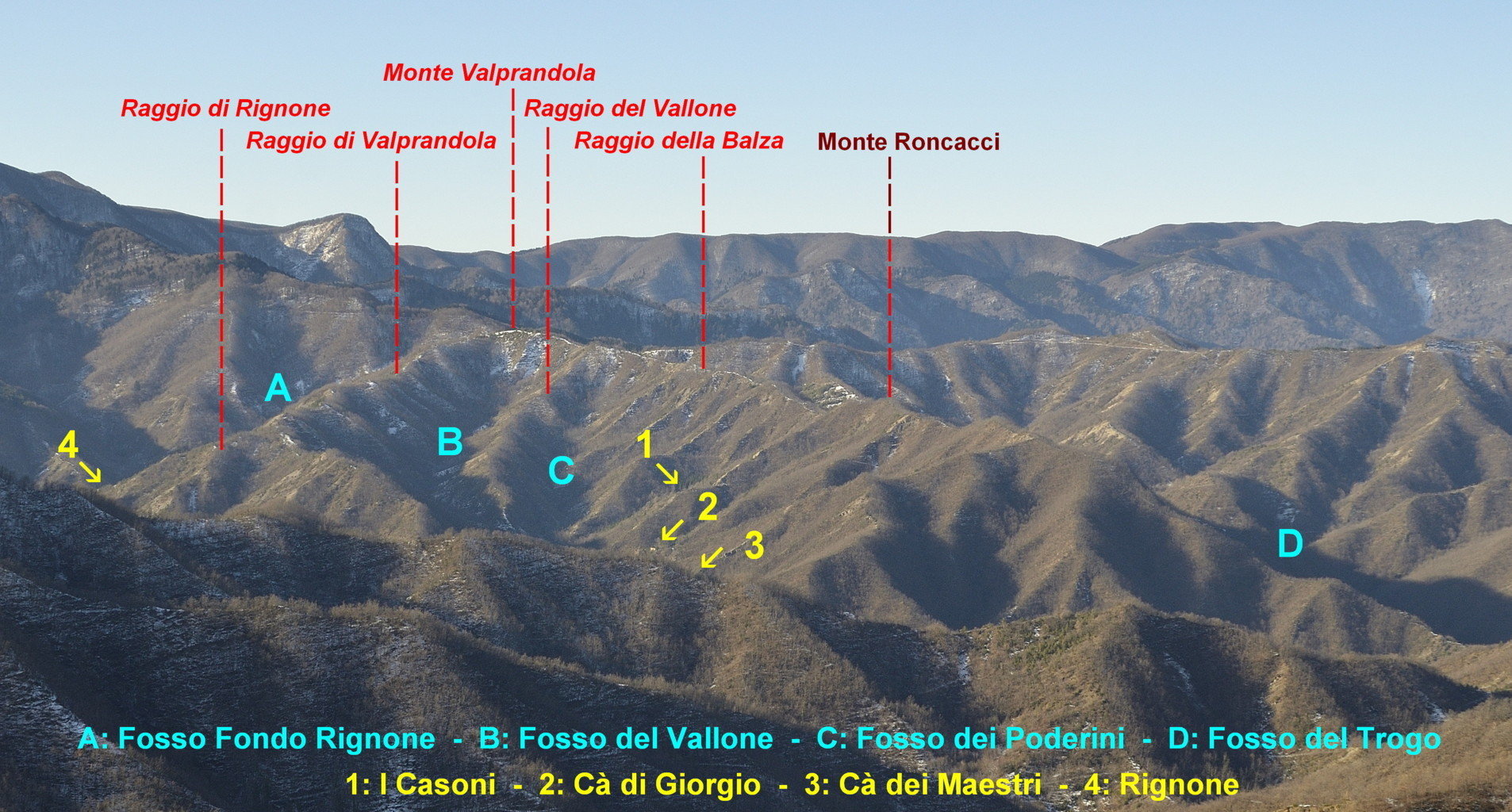 Oltre la sella tra il Paretaio e Siepe dell’Orso, mentre il contrafforte prosegue in direzione NNO rialzandosi con il picco di Croce di Romiceto, dal modesto rilievo posto dietro Siepe dell’Orso, da identificare con l’anticamente detto Monte Valprandola, si stacca una biforcazione di due dorsali più una intermedia, che si sviluppa con orientamento tra NNE e NE. La dorsale NE più meridionale, che si sviluppa fino al Bidente subito a monte di Pietrapazza, è da identificare con l’anticamente detto Raggio di Valprandola nel tratto più elevato e Raggio di Rignone nel tratto inferiore. La dorsale NNE più settentrionale è da identificare con l’anticamente detto Raggio della Balza o La Balza, comprendente il Monte Roncacci e va a terminare sul Bidente prima de La Cortina. Una dorsale minore compresa tra esse, da identificare con l’anticamente detto Raggio del Vallone, ha un breve sviluppo tutto interno alle dorsali principali. Dal Monte Roncacci si generano ulteriori dorsali minori che si sfrangiano verso il Bidente. Se l’oronimo Roncacci è una probabile formazione del XIX secolo (compare nella Carta d’Italia I.G.M. del 1894), anticamente tale picco non pare avesse preminenza identificativa nel Raggio della Balza (la morfologia coincide con il significato toponomastico), mentre l’oronimo Monte Valprandola, in base alle ricerche archivistiche di C. Bignami e A. Boattini (2018, cit.), corrisponderebbe al rilievo indicato ma oggi è del tutto desueto, come l’altra toponomastica citata.