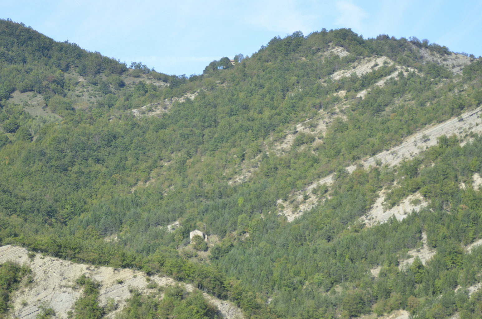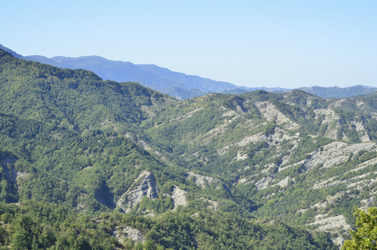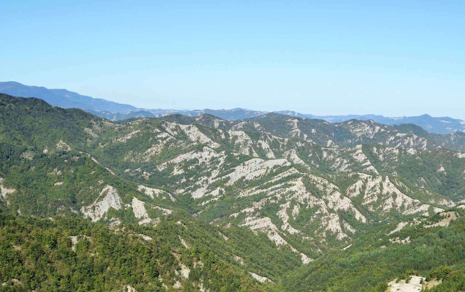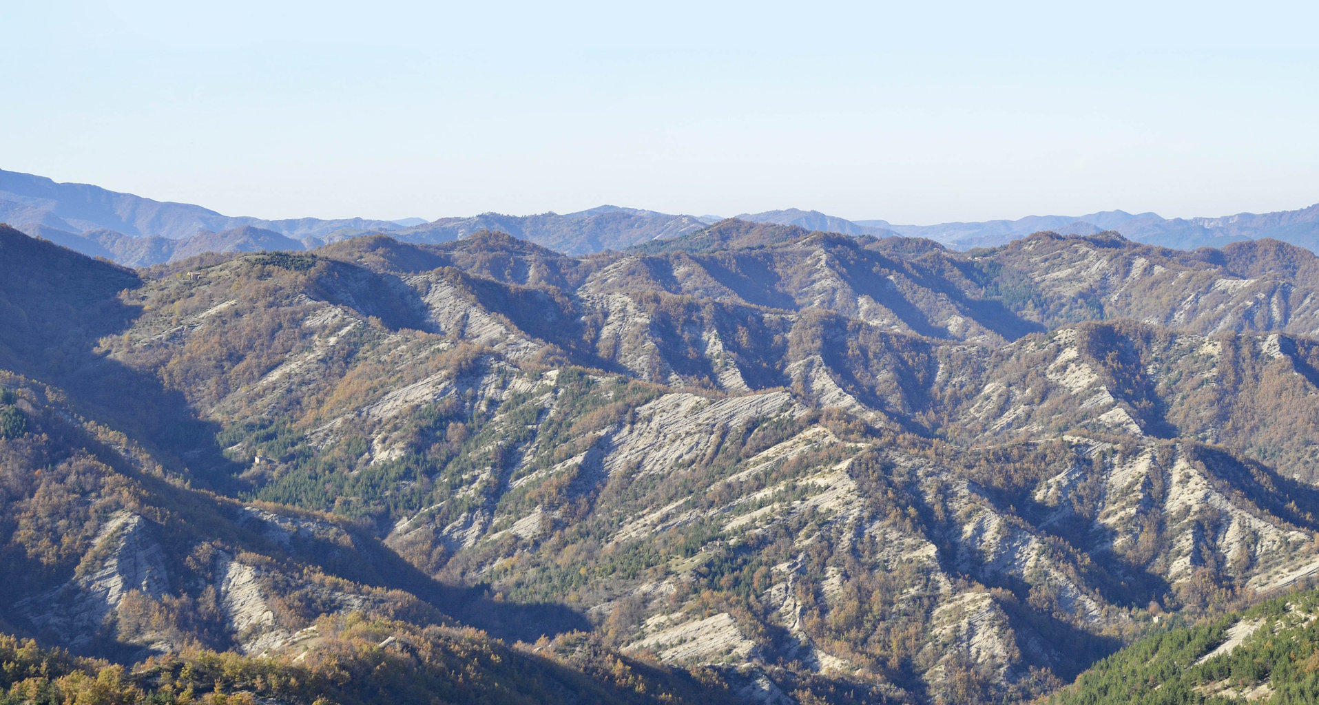 Probabilmente all’interno di uno dei primordiali avvallamenti sopra descritti potrebbe essersi originato l’assetto orografico dell’Appennino tosco-romagnolo e quindi attinente all’Alta Valle del Fiume Bidente, quale parte del sistema montano accennato da Mini nella citazione sopra riportata, laddove la catena appenninica presenta evidenti inflessioni alle quali si accompagna un vario orientamento delle diramazioni montuose che si staccano ad oriente dividendo i sistemi vallivi, con una regolarità morfologica che conferma quanto siano geologicamente recenti, a differenza dei territori circostanti, specie toscani, dove le catene montane sono disposte nelle più varie direzioni con datazioni di rocce che possono risalire fino a 300 milioni di anni BP, ricadendo pertanto nel Paleozoico.