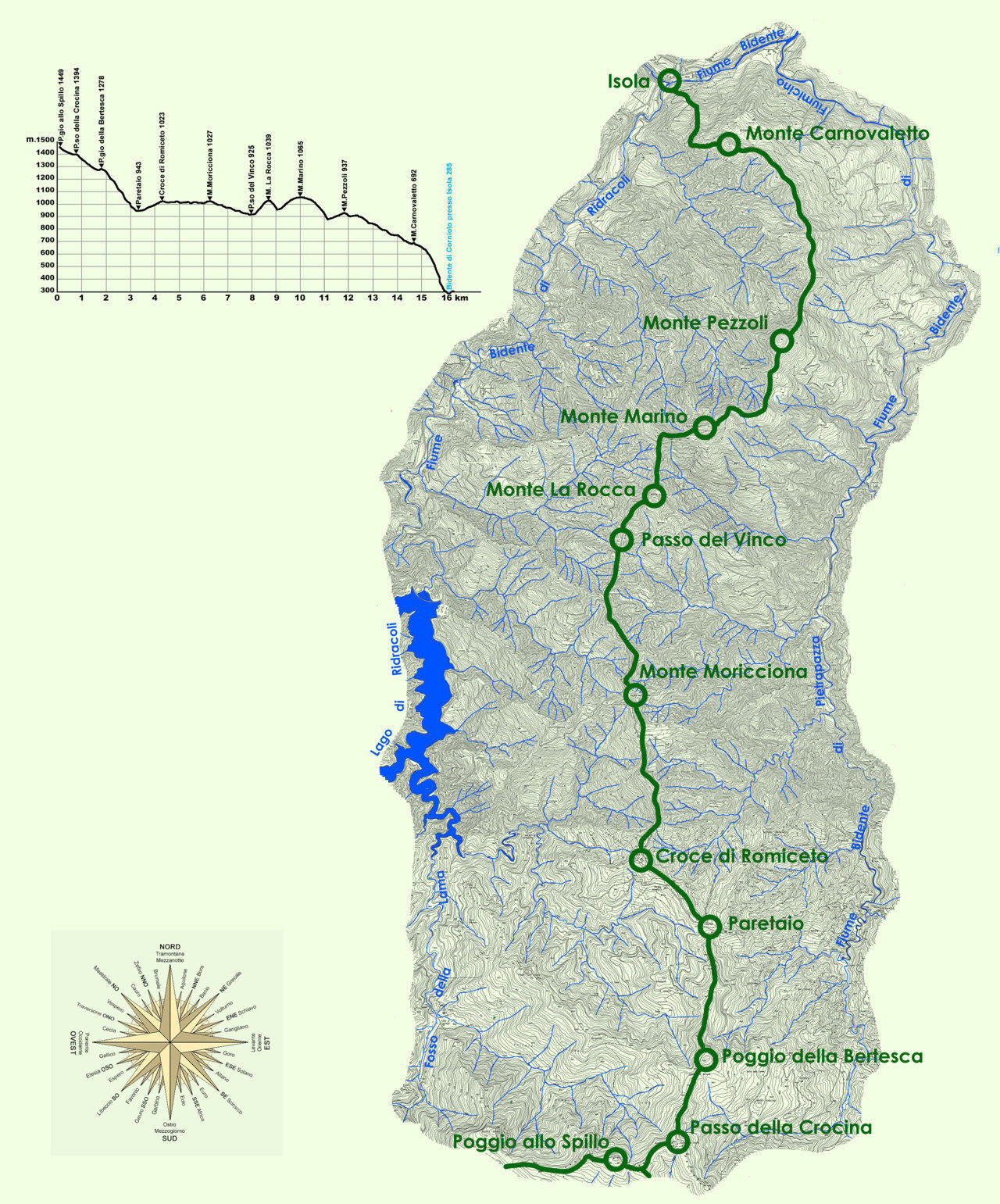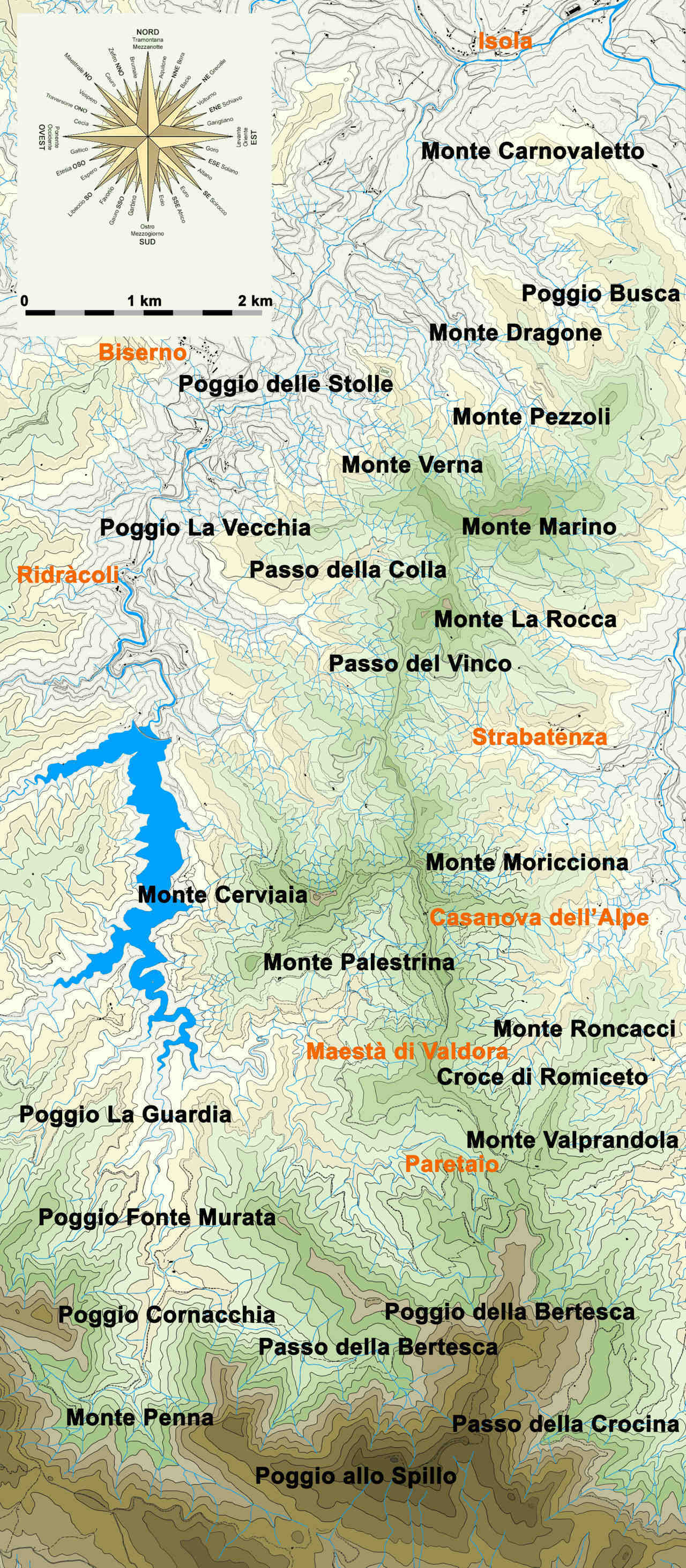 Con pendenza non eccessiva il contrafforte si sviluppa ora fino alla lunga e ristretta sella intagliata dalla pista forestale che ha inizio con la Ripa di Ripastretta e termina con la Colla ed il Passo del Vinco, dove si biforca per scendere con lunghi percorsi moderni verso Ridràcoli e verso Poggio alla Lastra con deviazione per Strabatenza. La viabilità antica guadagnava invece le sommità dei Monti La Rocca e Marino, venendo attraversata dalla nota Mulattiera di Ridràcoli sul Passo della Colla, però sul versante orientale proseguiva preferibilmente a mezza costa. Dalla Colla del Monte, cerniera tra i Monti La Rocca e Marino, due dorsali si sviluppano verso la valle di Ridràcoli evidenziando rispettivamente il Poggio la Vecchia e il Poggio delle Stolle, mentre su una diramazione minore proveniente direttamente dal Marino spicca il Monte Verna. Lo sviluppo del contrafforte secondario prosegue oltre il Monte Marino disegnando un ampio arco diretto verso Isola, con perdite di quota a partire dal Monte Pezzoli da cui si stacca un’altra dorsale che penetra nella valle di Ridràcoli parallelamente al Poggio delle Stolle evidenziando il Monte Dragone. Seguono Poggio Busca, già Croce La Lastra ed altri picchi minori fin quasi al termine, quando il contrafforte si sdoppia, così se da un lato il Monte Carnovaletto con le sue diramazioni chiude la valle di Ridràcoli presso Isola, dall’altro lato il Raggio delle Rondini si sviluppa fino ai pressi di Capaccio vicino a S.Sofia, ma al suo inizio evidenzia la Torre della Rondinaia.